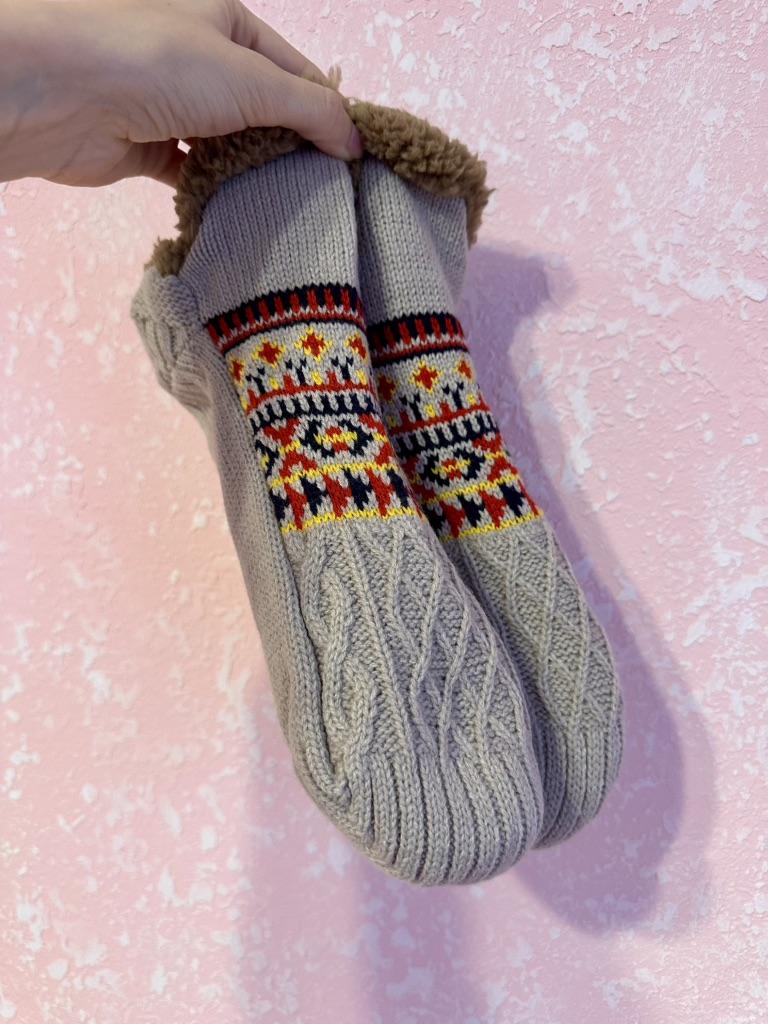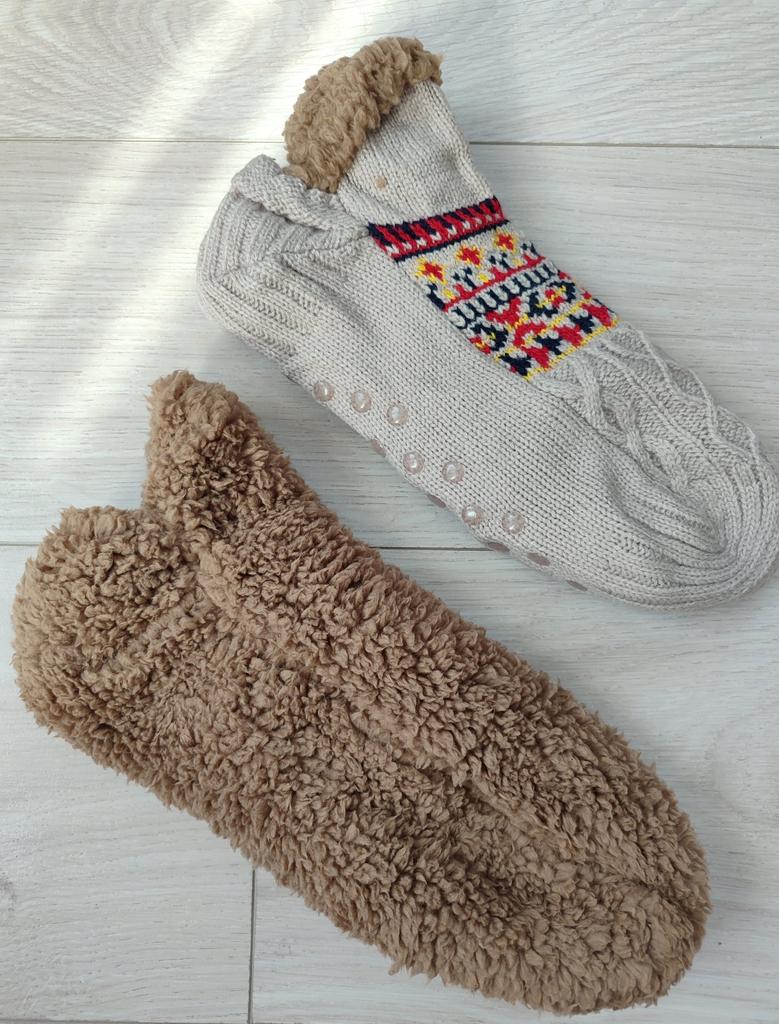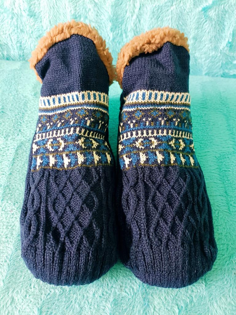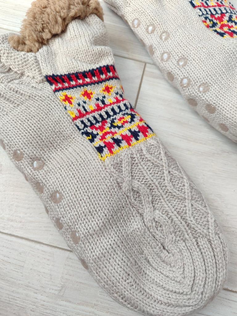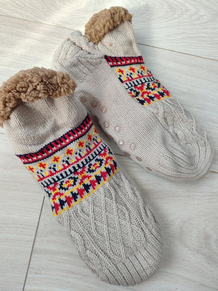 Тёплые носки-тапочки с мехом внутри. Доставка заняла меньше месяца до отделения Укрпочты. Упакованы носки в индивидуальный пакет. В магазине на выбор есть 3 варианта расцветки, я заказала серые с орнаментом. Размер у меня до 40. На мою стопу 26 см, носки подошли отлично, подойдут и на ногу большего размера. Материал приятный, снаружи вязанные, внутри искусственный мех. На подошве нескользящие тормозки, для любителей ходить босиком - идеально, на ламинате вообще не скользят. В качестве домашних тапочек на зиму - отличный вариант, носочки удобные и тёплые, я довольна.