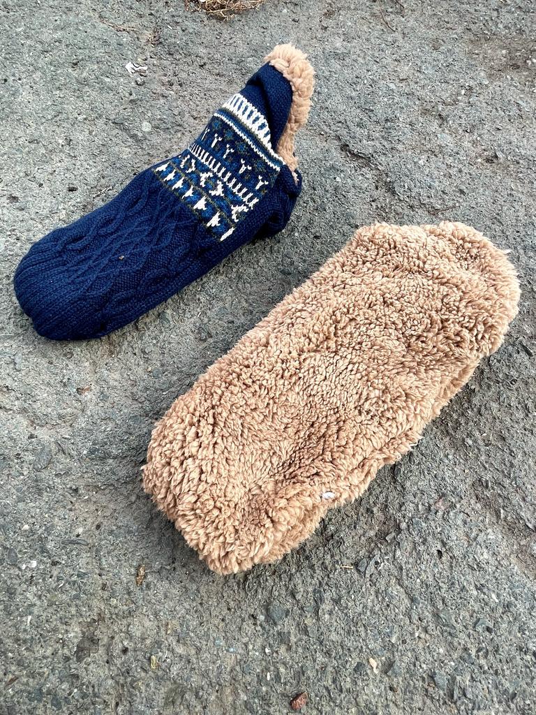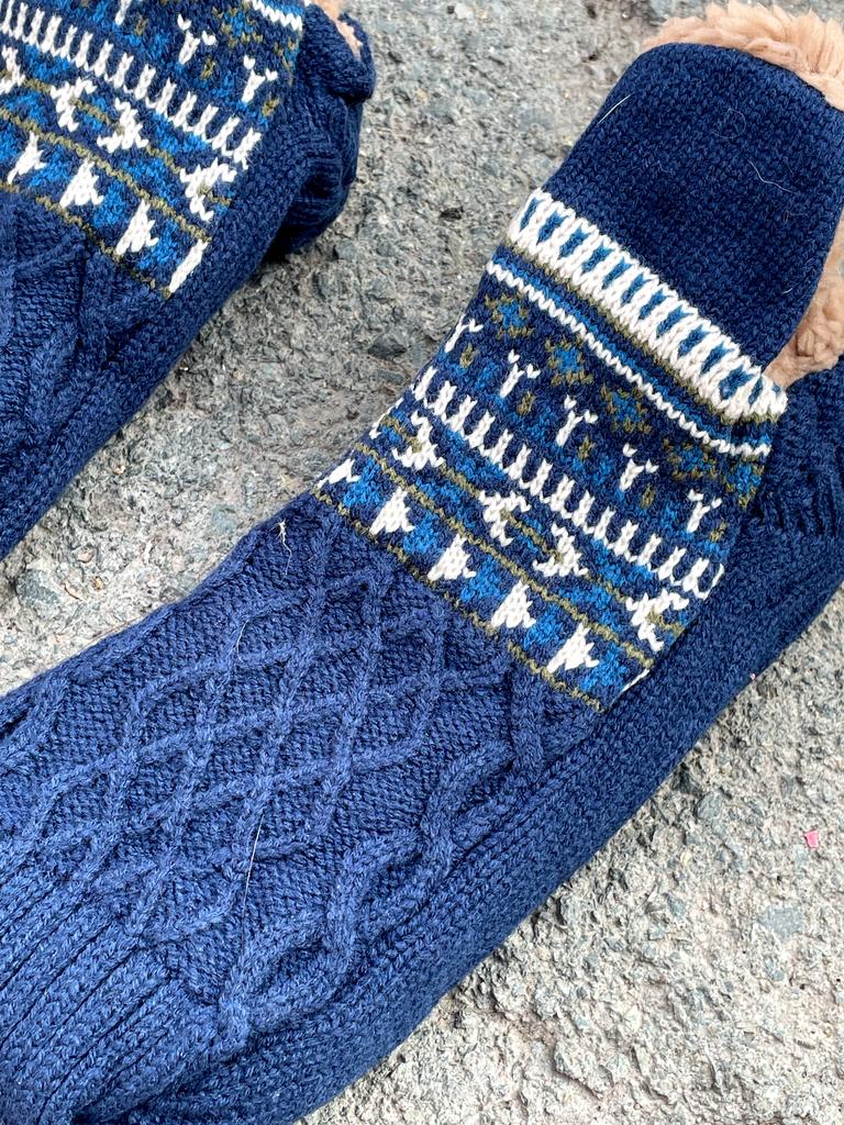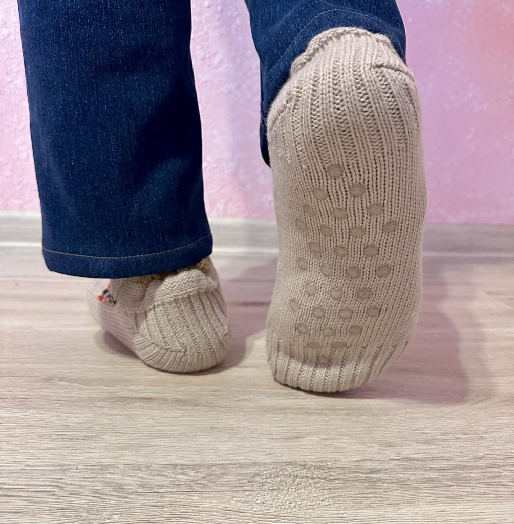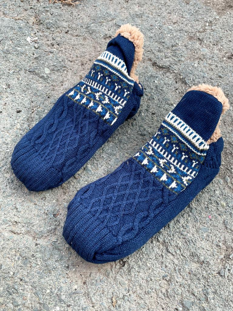 Тёплые носки-тапочки с мехом внутри. Доставка заняла меньше месяца до отделения Укрпочты. Упакованы носки в индивидуальный пакет. В магазине на выбор есть 3 варианта расцветки, я заказала серые с орнаментом. Размер у меня до 40. На мою стопу 26 см, носки подошли отлично, подойдут и на ногу большего размера. Материал приятный, снаружи вязанные, внутри искусственный мех. На подошве нескользящие тормозки, для любителей ходить босиком - идеально, на ламинате вообще не скользят. В качестве домашних тапочек на зиму - отличный вариант, носочки удобные и тёплые, я довольна.