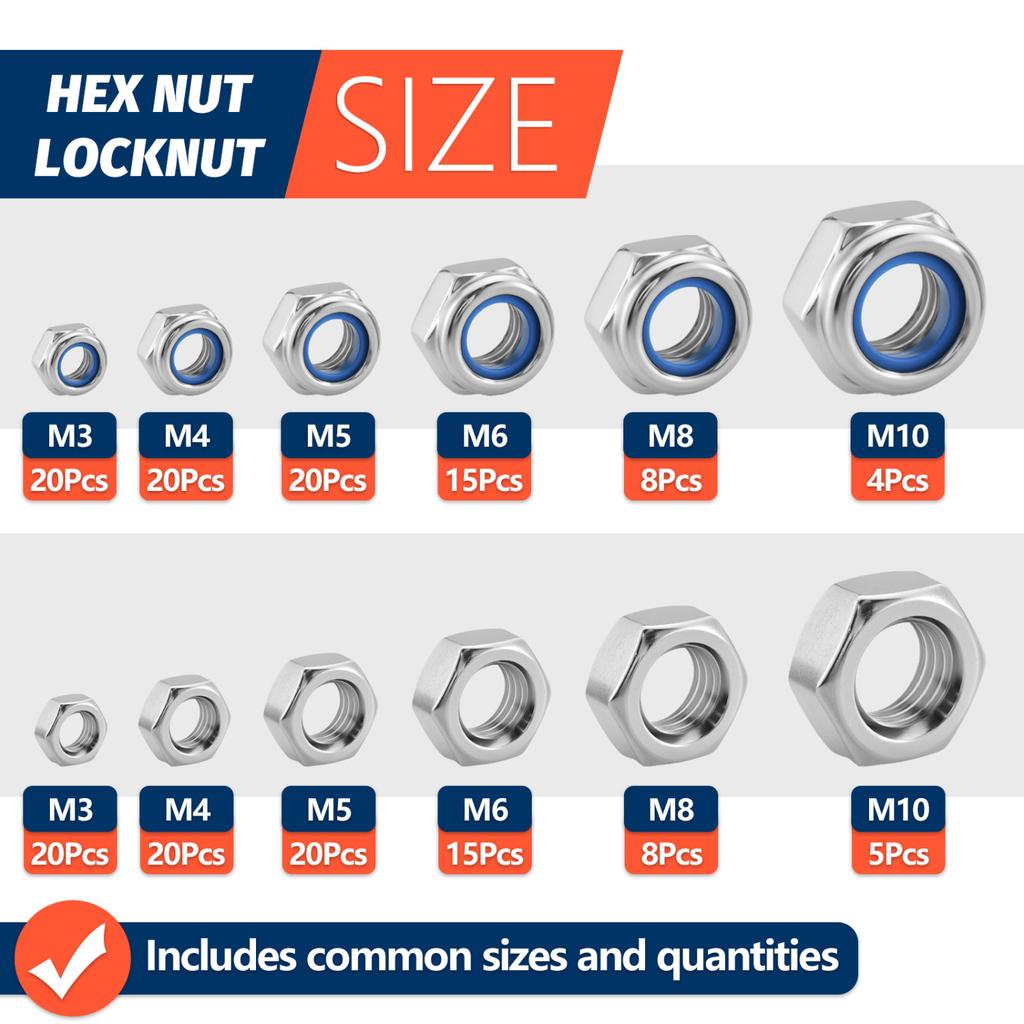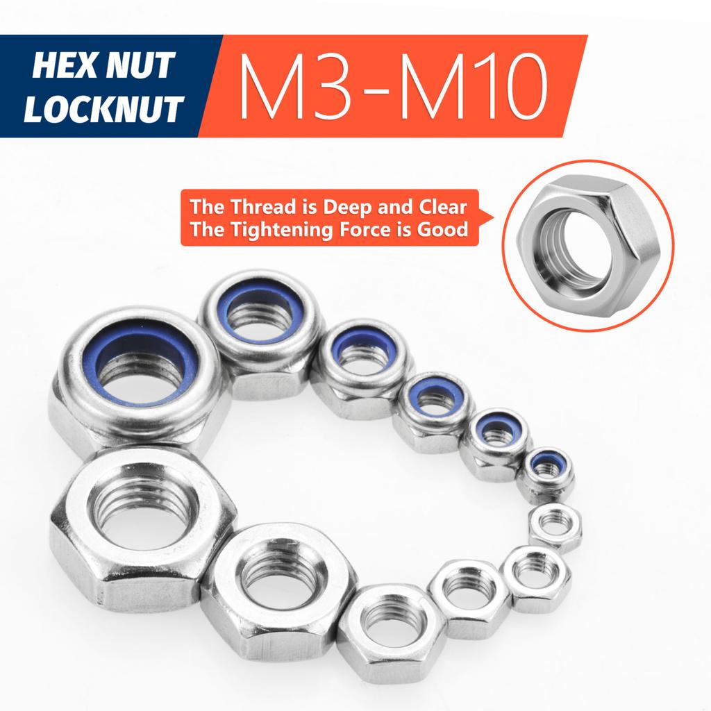 Набор контргаек и шестигранных гаек M3 M4 M5 M6 M8 M10 из нержавеющей стали, 175 шт., набор гаек с метрической нейлоновой вставкой и шестигранных гаек