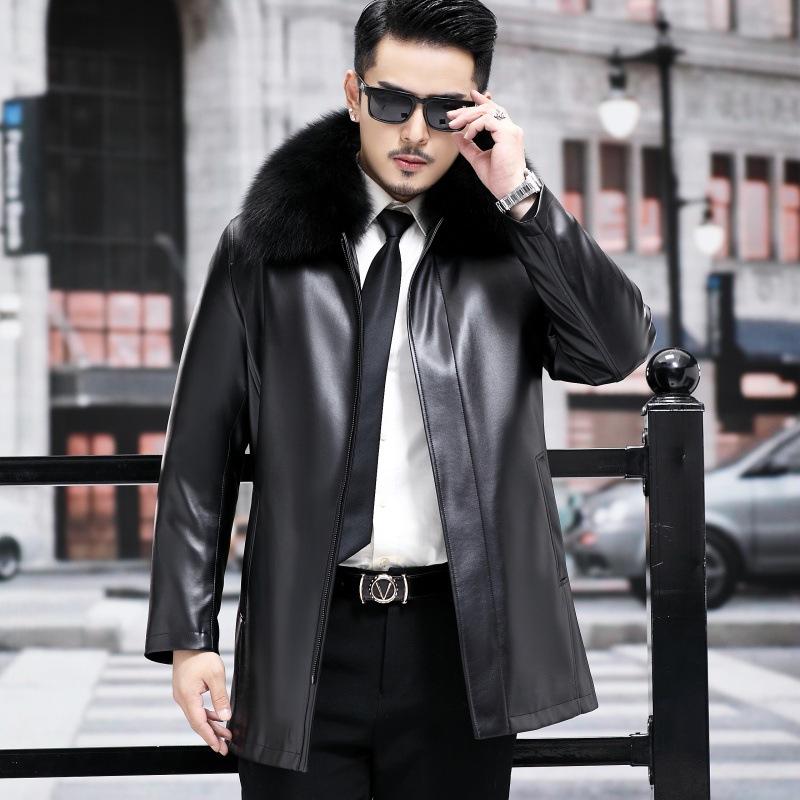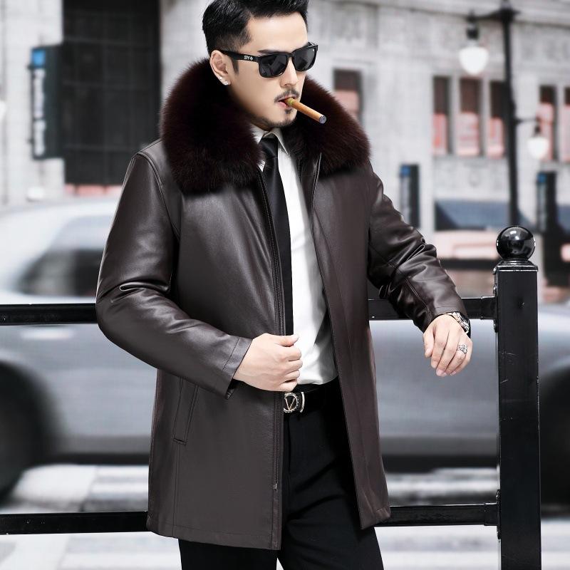 Куртка из натуральной кожи мужская зимняя для пап среднего возраста, дубленка средней длины, подкладка из лисы и норки золотистого цвета