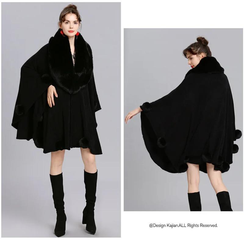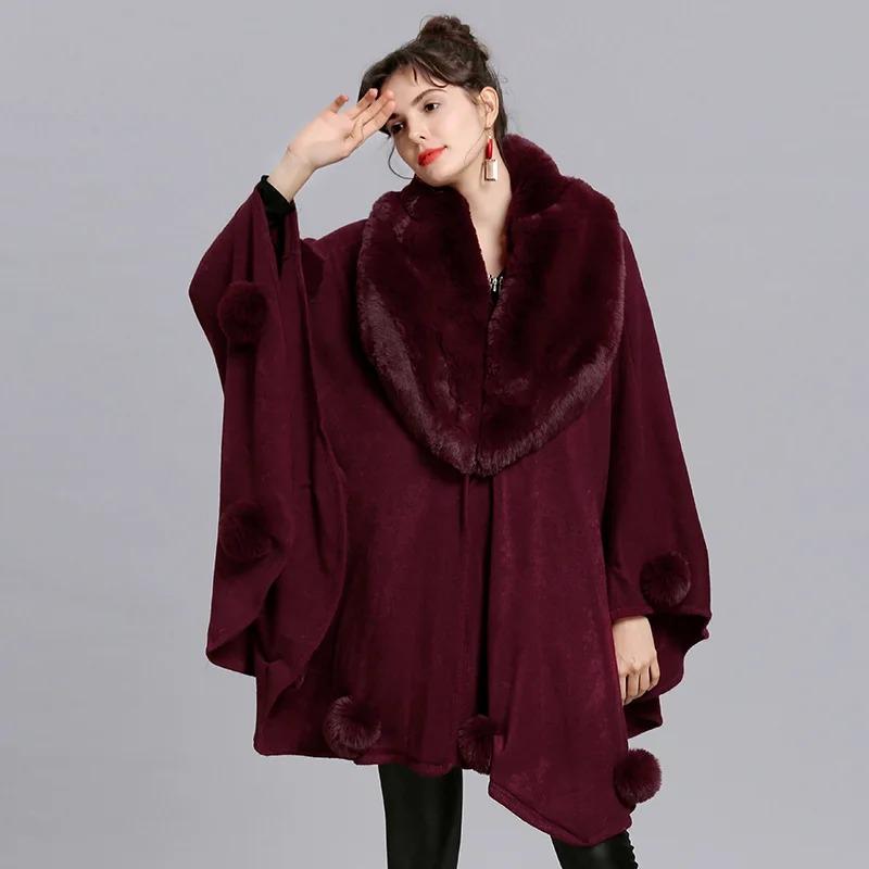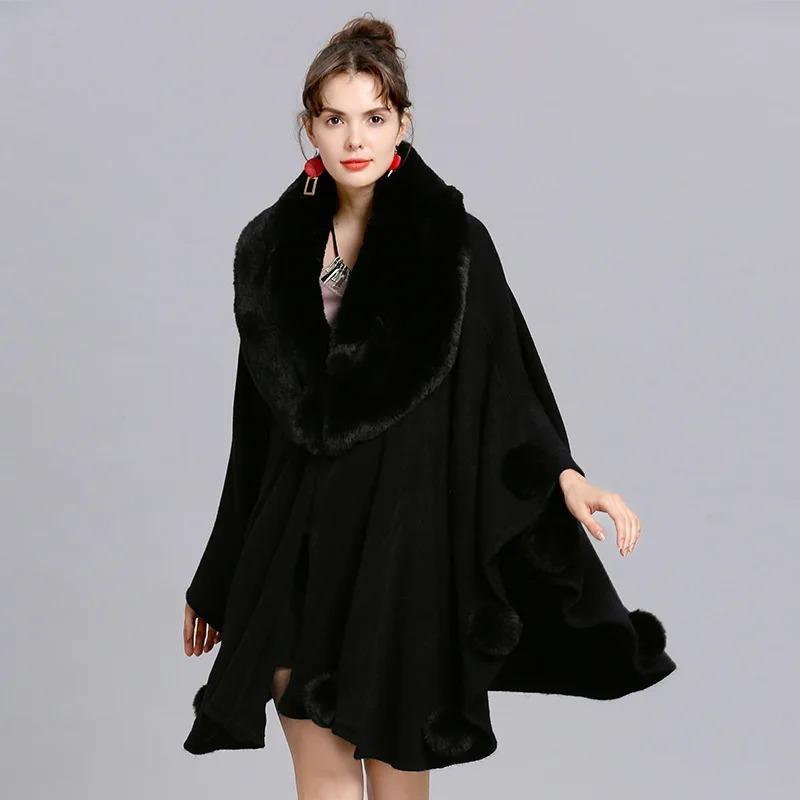Женская черная большая накидка-маятник, пончо, зимняя меховая шаль, вязаный свитер большого размера, кардиган с воротником из искусственного лисьего меха
