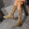 2024 Новые винтажные замшевые женские сапоги до колена, остроносые тапочки цвета хаки, толстые туфли на среднем каблуке в этническом стиле