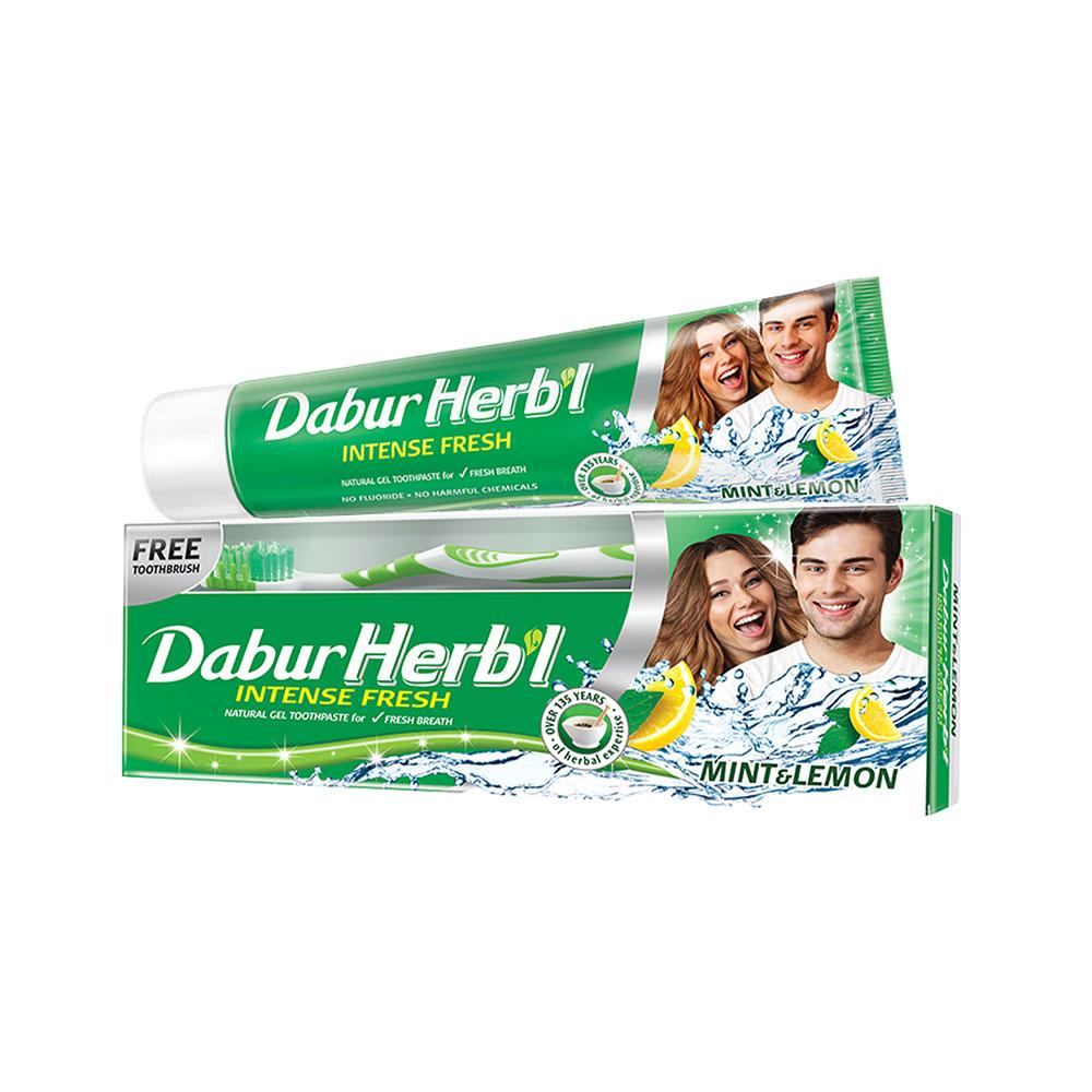 Зубная паста Dabur Herbal Intense Fresh Gel обогащена уникальной смесью мяты и лимона, которая обеспечивает длительную интенсивную свежесть.. Натуральный экстракт свежей мяты и лимона помогает поддерживать гигиену полости рта и здоровье десен.. Антибактериальные и противовоспалительные свойства дарят вам свежее дыхание.. Экстракт лимона в зубной пасте действует как отбеливающее средство и делает ваши зубы белее.. Не содержит фтора и вредных химикатов.. В комплект зубной пасты Dabur Herbal Intense Fresh Gel входит зубная щетка.