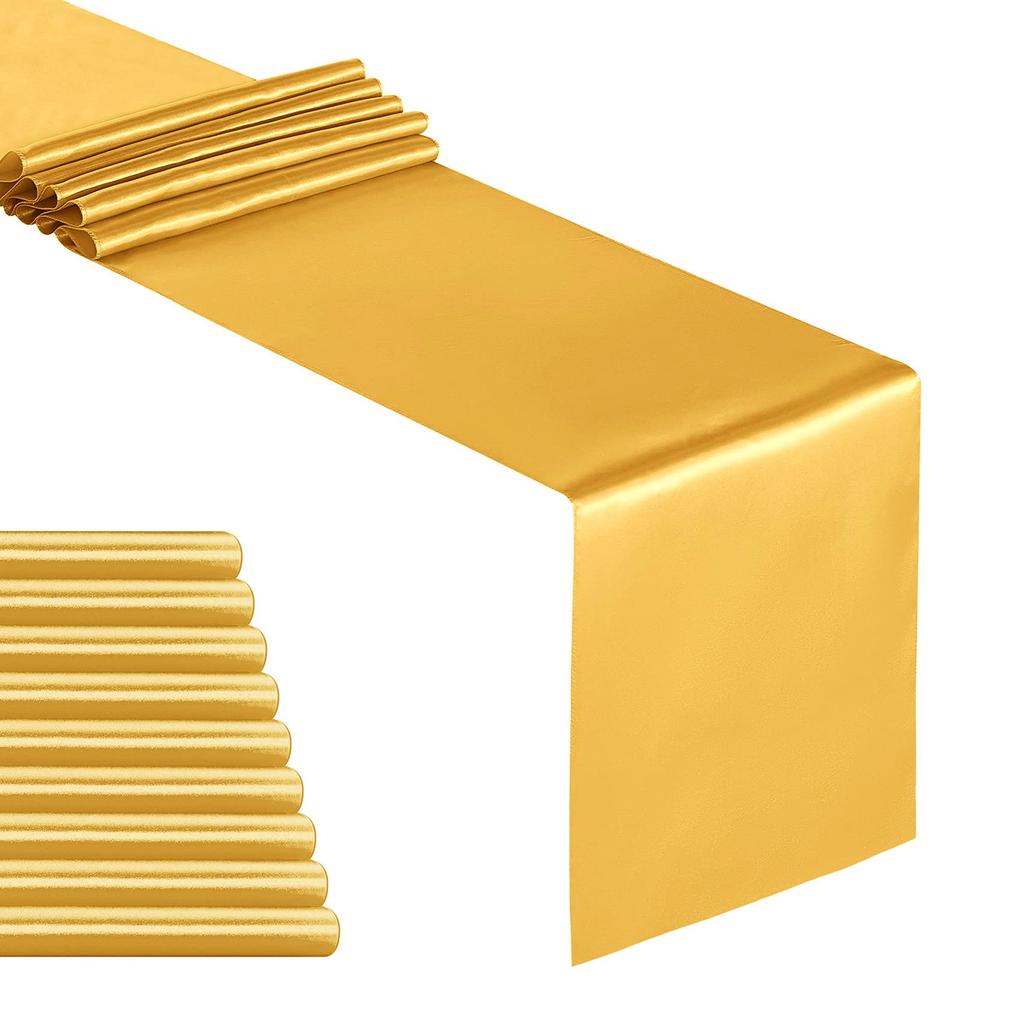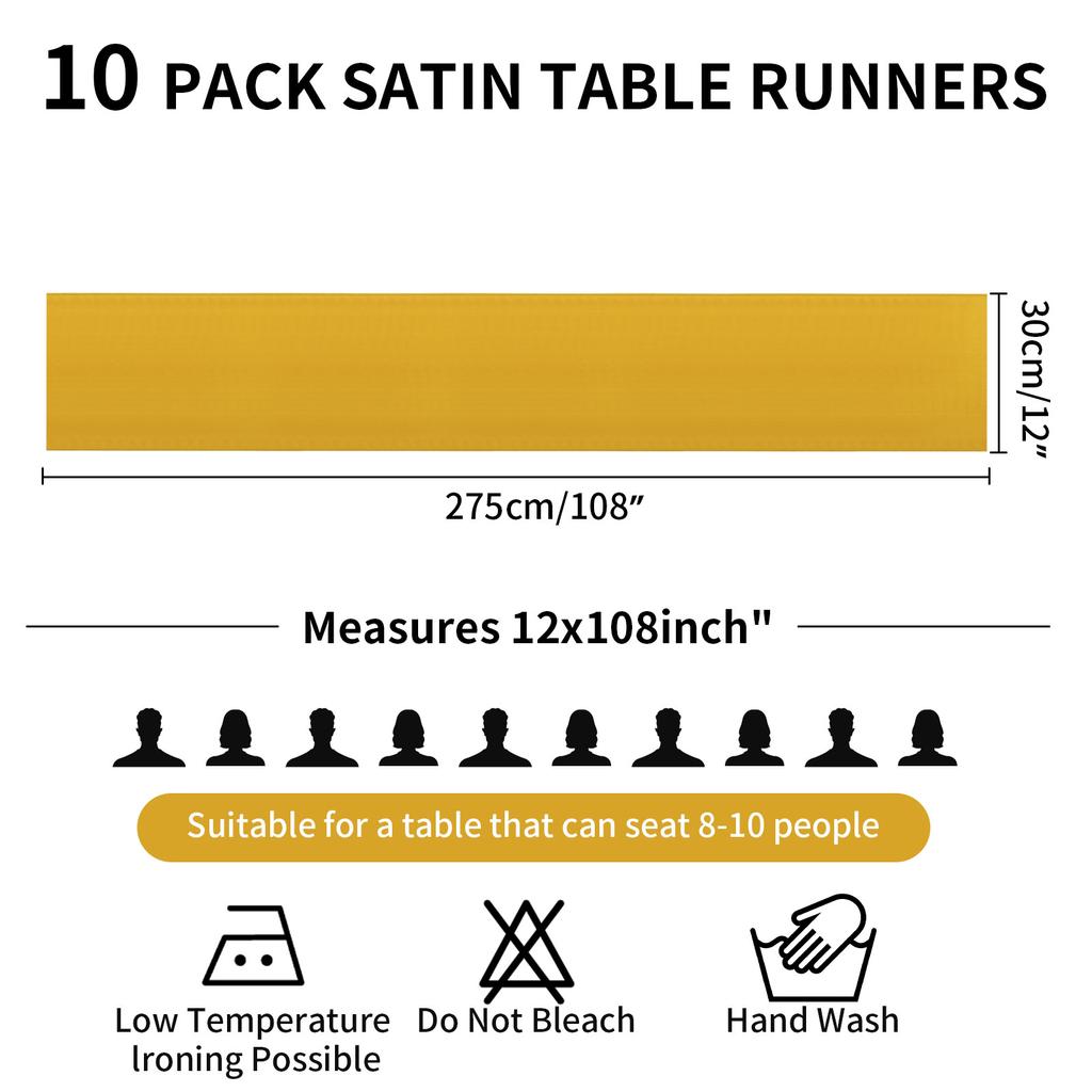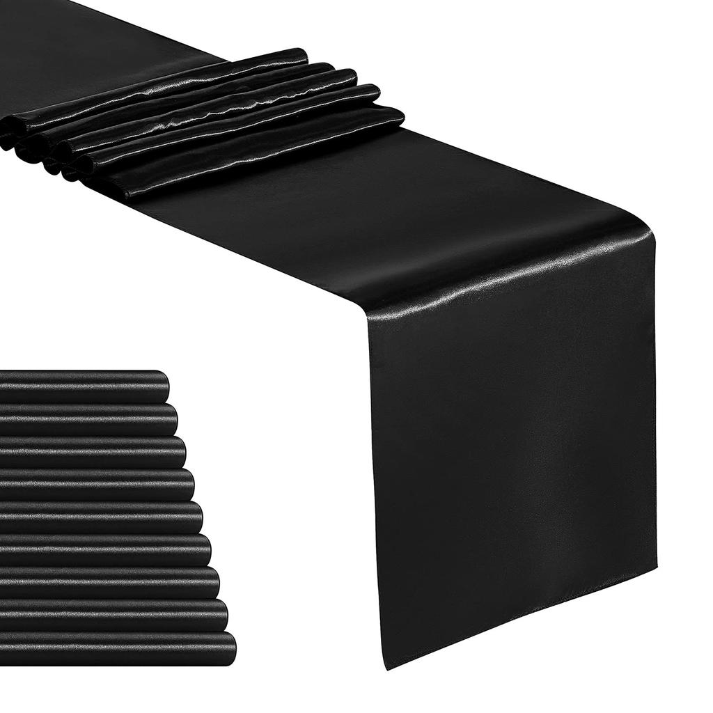Упаковка из 10 атласных дорожек для стола 12x108 дюймов длиной, черные, золотые дорожки для свадеб, дней рождения, вечеринок, шелковая гладкая ткань, украшения
