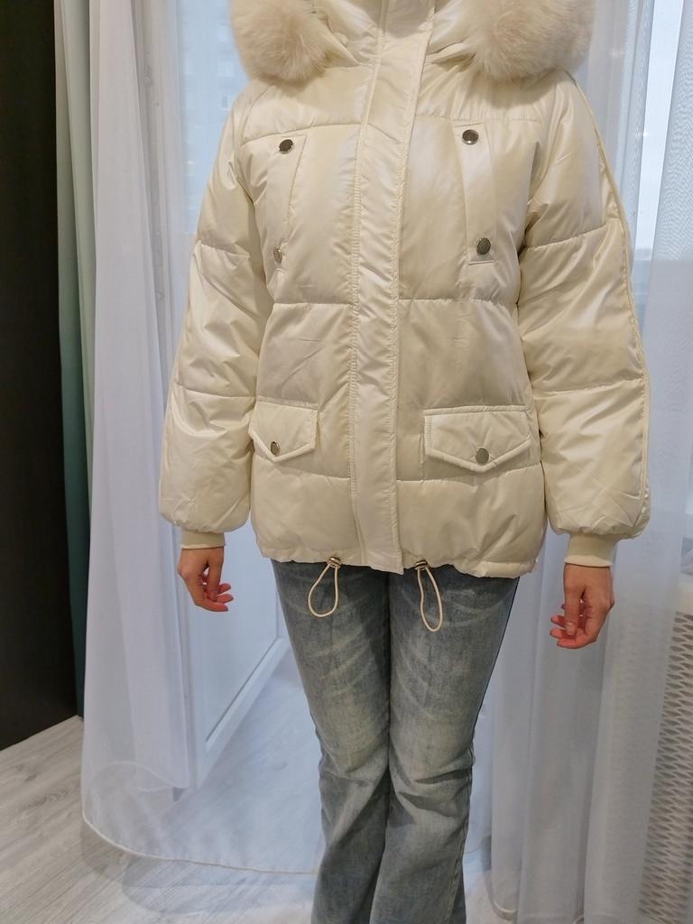 Отличная курточка, мех искуственный, но очень хорошо сделанный, красиво смотрится. И в целом, курточка очень нарядная, подошла на девушку рост 163 см, вес 50 кг. Ткань белая с перламутровым оттенком, стильно