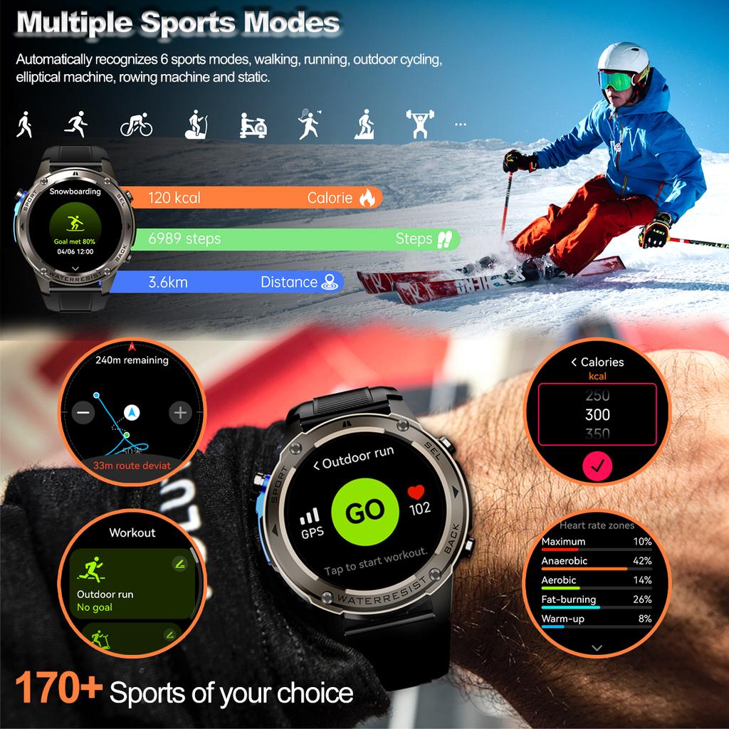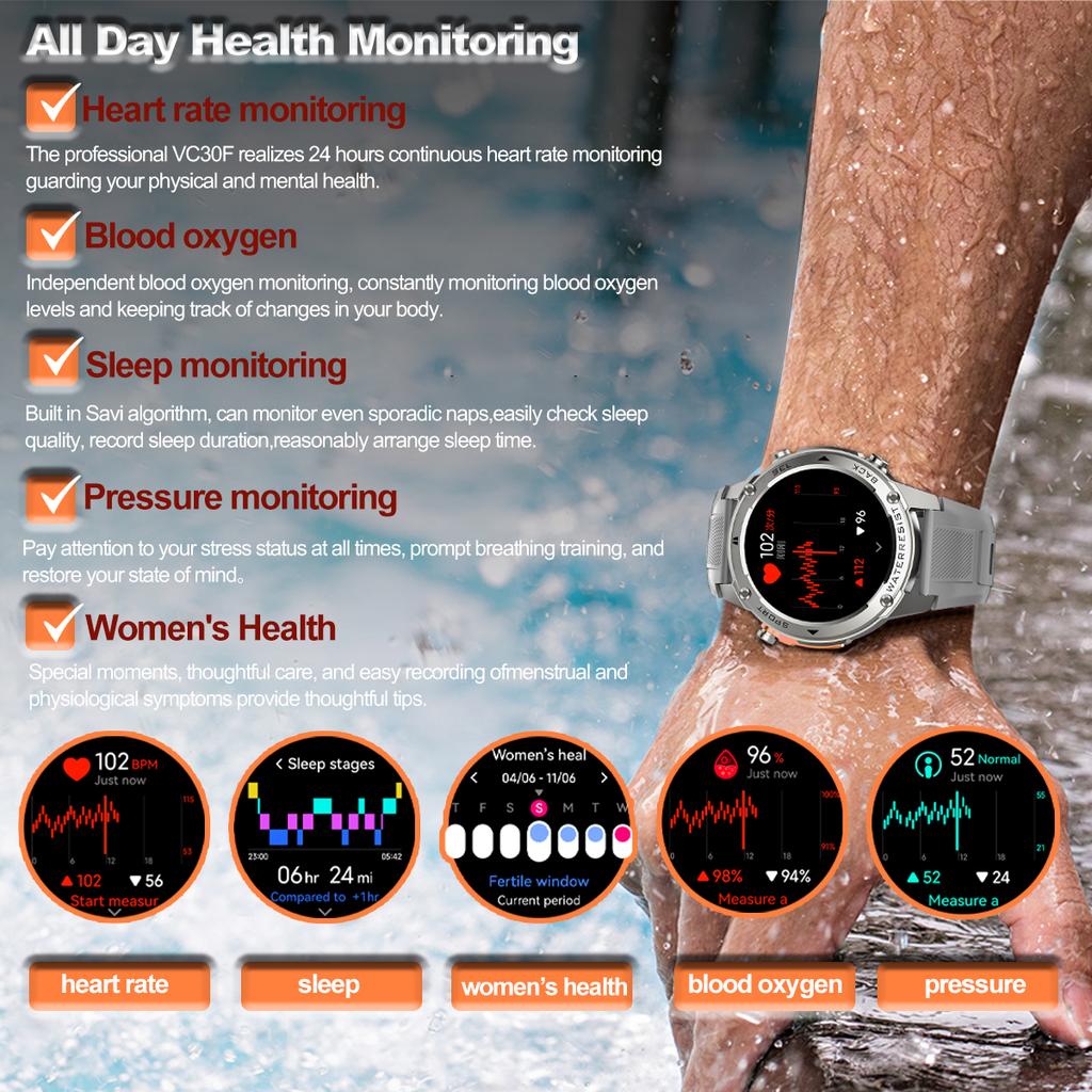 24-часовой мониторинг: Частота пульса на запястье (Оповещения об аномальном сердечном ритме), Частота сердечных сокращений на запястье, SpO2(Кислород кислорода) Измерение уровня, уровень стресса, шаг, положение стоя, количество сожженных калорий, расстояние в реальном времени.