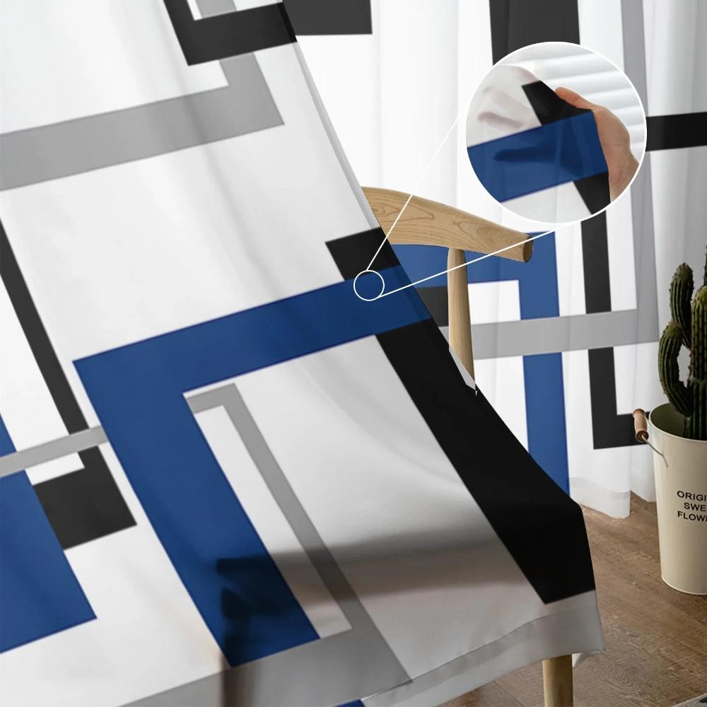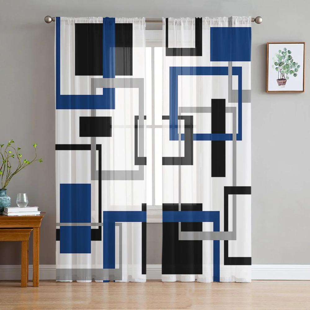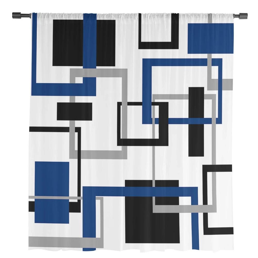 Абстрактная геометрия Квадрат Современное искусство Черный Синий Прозрачные шторы Украшение гостиной Оконная штора Кухня Тюль Вуаль Шторы