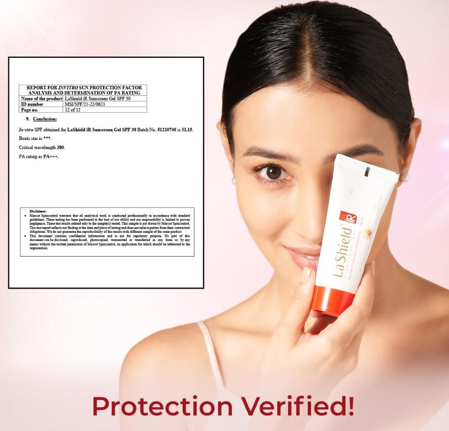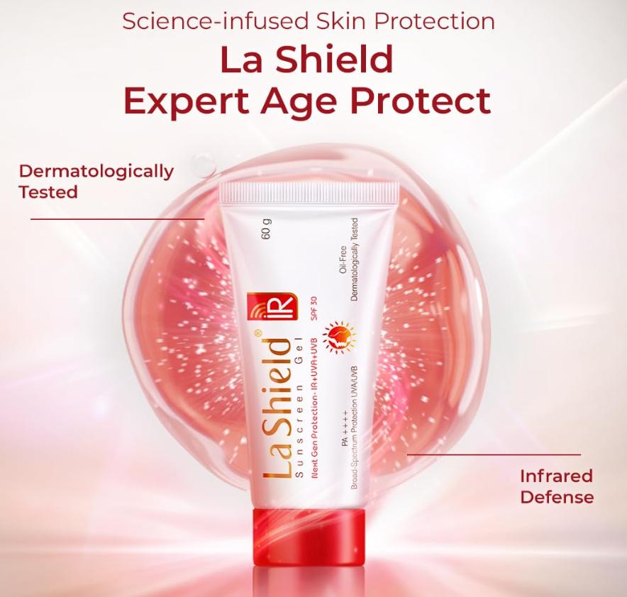 Солнцезащитный гель La Shield IR с SPF 30 и PA++++ . Это легкая формула нового поколения, специально созданная для людей, которые в основном проводят время в помещении.. Оптимально защищает кожу не только от ультрафиолета А (UVA) и ультрафиолет В (UVB) лучи, но и инфракрасные (инфракрасный) лучи, излучаемые экранами телевизоров, компьютеров, галогенными лампами и т. д.