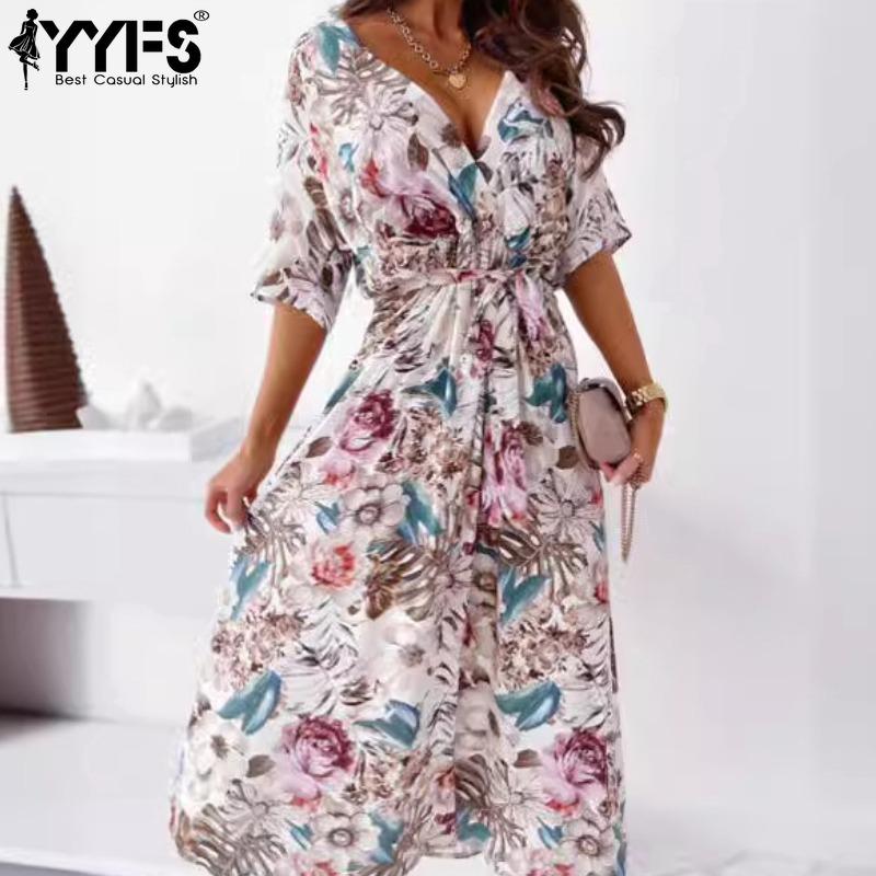 YYFS Женская мода лето весна цветочный узор принт с коротким рукавом V-образным вырезом с высокой талией повседневные платья