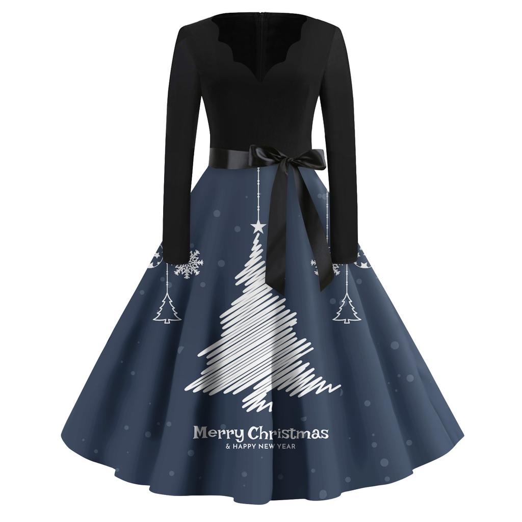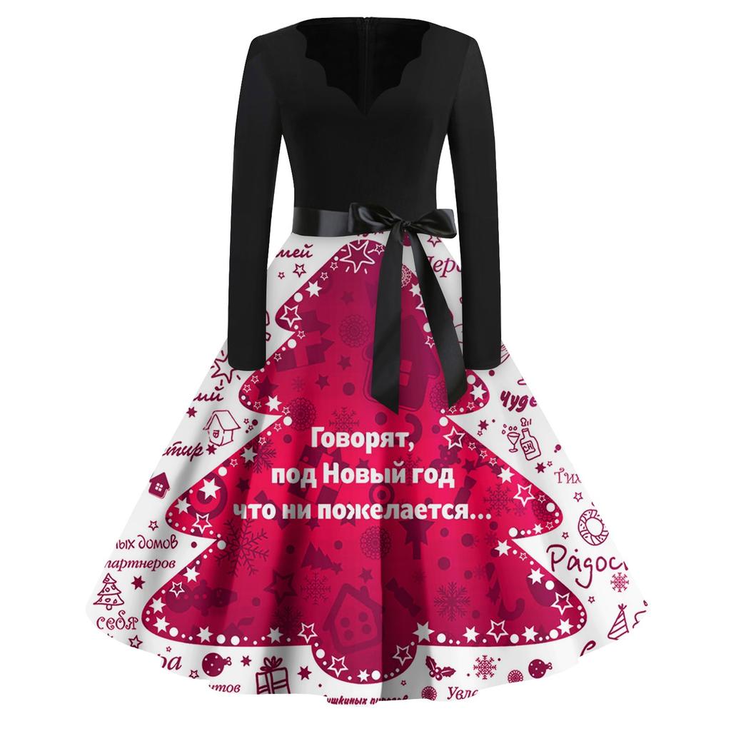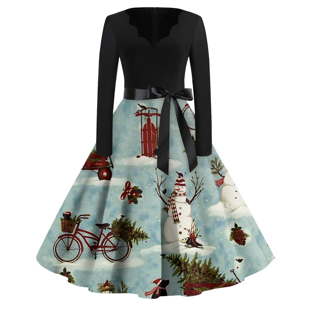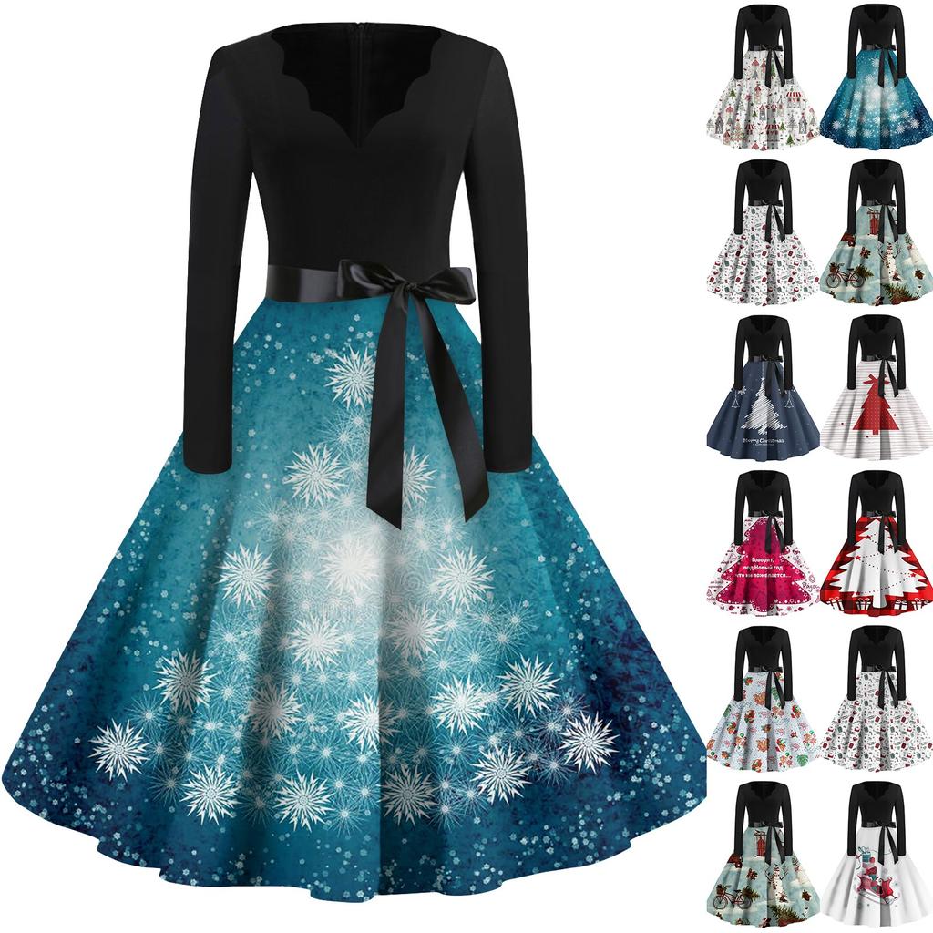 Женская мода винтаж с длинным рукавом и V-образным вырезом с рождественским принтом вечерние платья платья