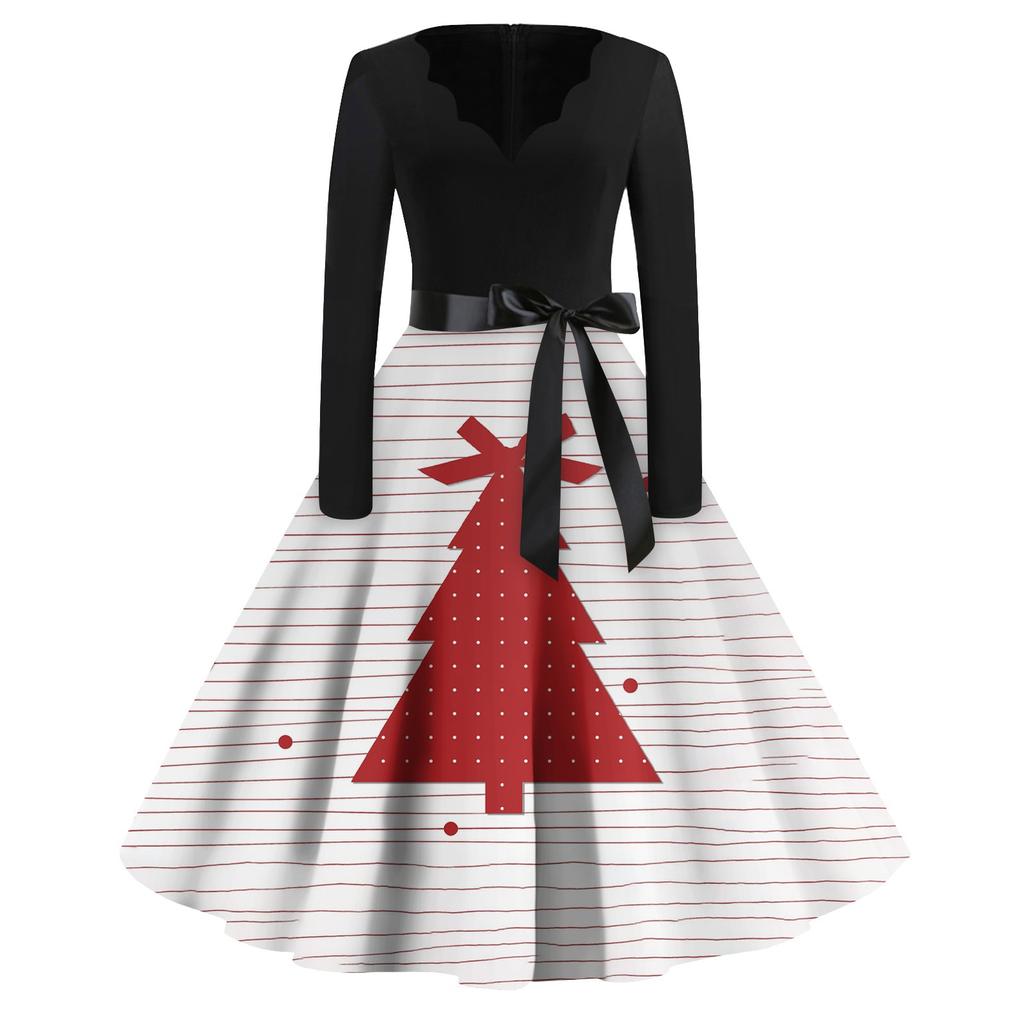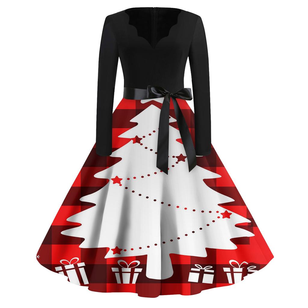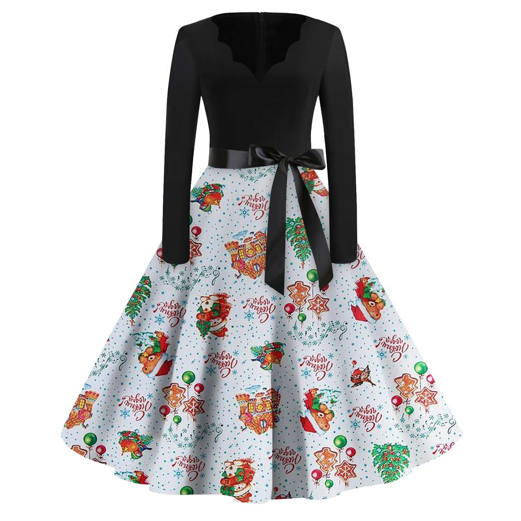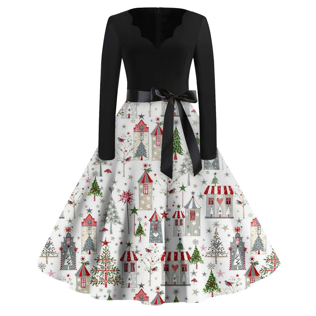 Женская мода винтаж с длинным рукавом и V-образным вырезом с рождественским принтом вечерние платья платья