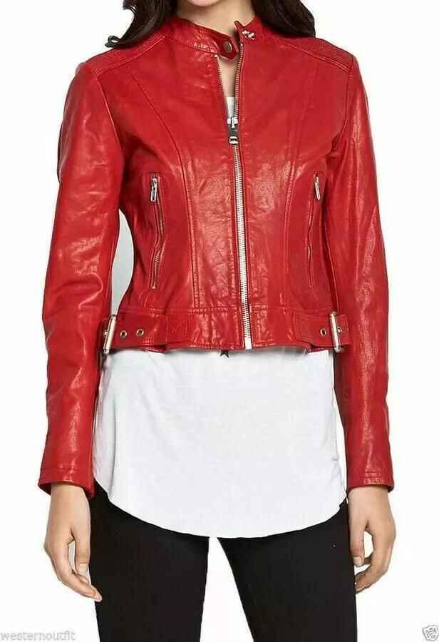 Женская стильная красная короткая байкерская кожаная куртка ручной работы из натуральной овчины