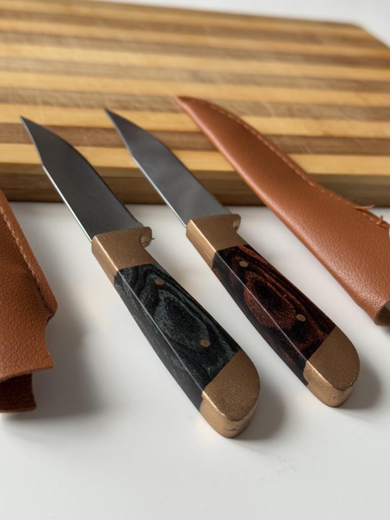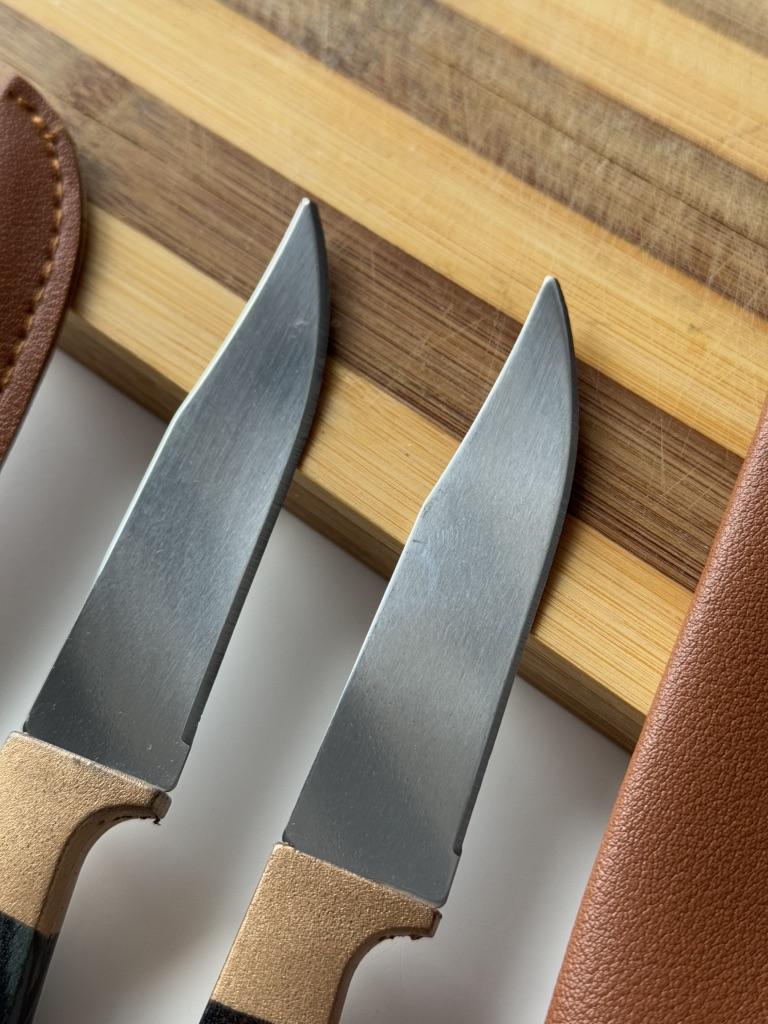 Нож 🔥🔪 Отличные ножи за такую цену, в комплекте идут два ножа. Ножи маленькие. Очень острые, режут просто замечательно. Ножи идут в комплекте с чехлом, чехол один слегка распустился, но не критично, я все равно не буду хранить их в чехле. Чехлы выполнены из плотной искусственной кожи. Лезвия острые из нержавеющей стали. За счёт чехла ножи можно брать с собой. Ручка гладкая, из пластика, в руке лежит отлично. Нож отлично подойдёт для чистки картошки, а я брала для масла. По весу ножи лёгкие. Доставка около трёх недель, приехали хорошо упакованные, в пупырке, чехле, на кончик ножа надеты пластиковая защита. Трек-номер отслеживался. К покупке рекомендую 👍🏼