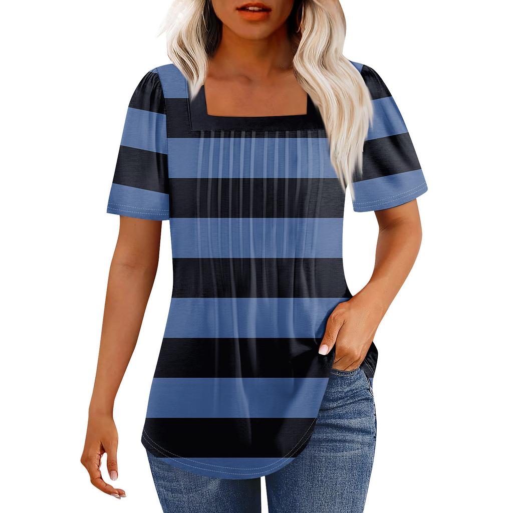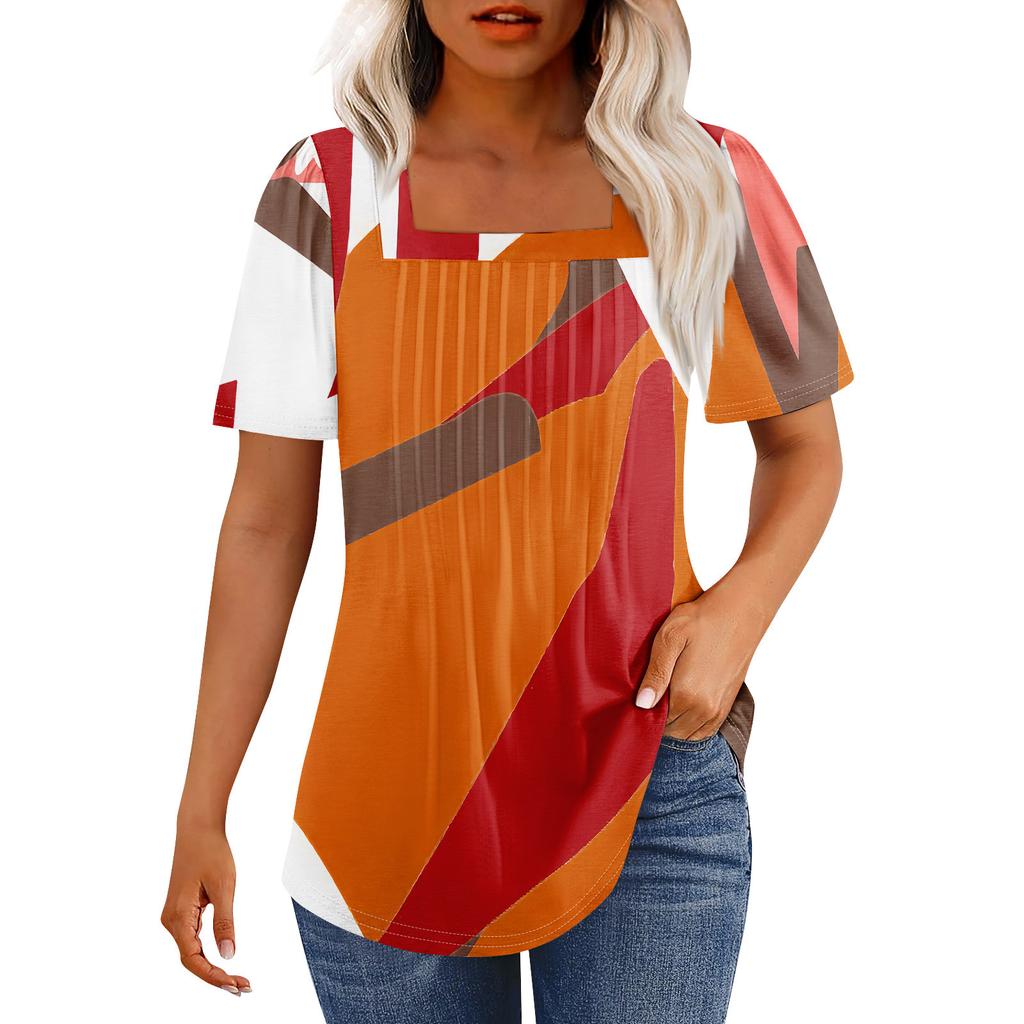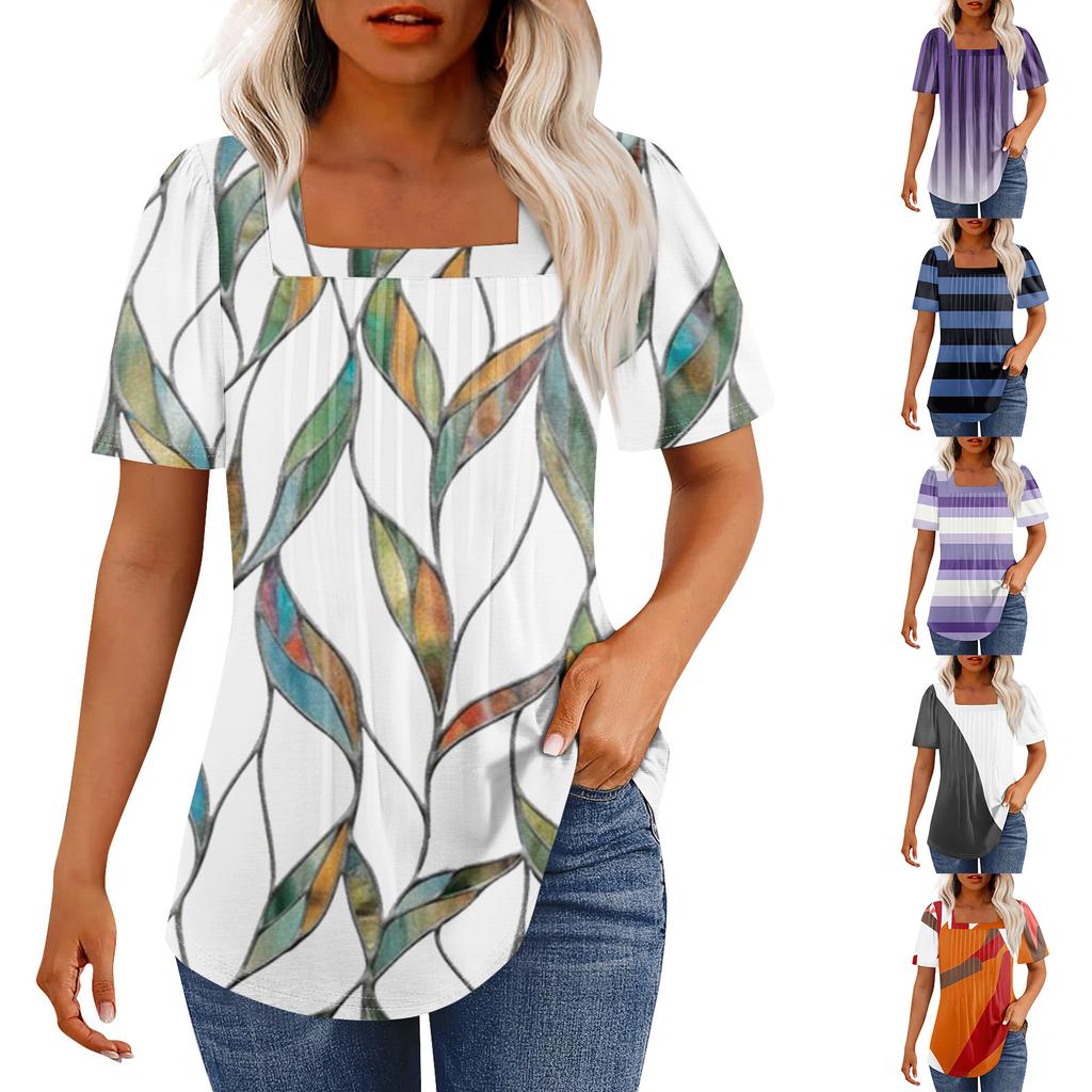 Футболки для женщин, плиссированные, с квадратным вырезом, нарядные, повседневные, блузки с принтом, с коротким рукавом, летние топы свободного кроя