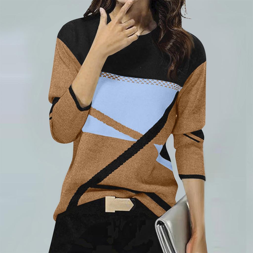 Женская зимняя мода с контрастным позиционированием и принтом с круглым вырезом и длинными рукавами