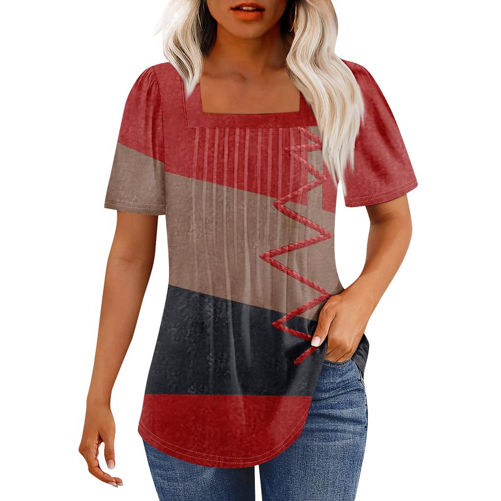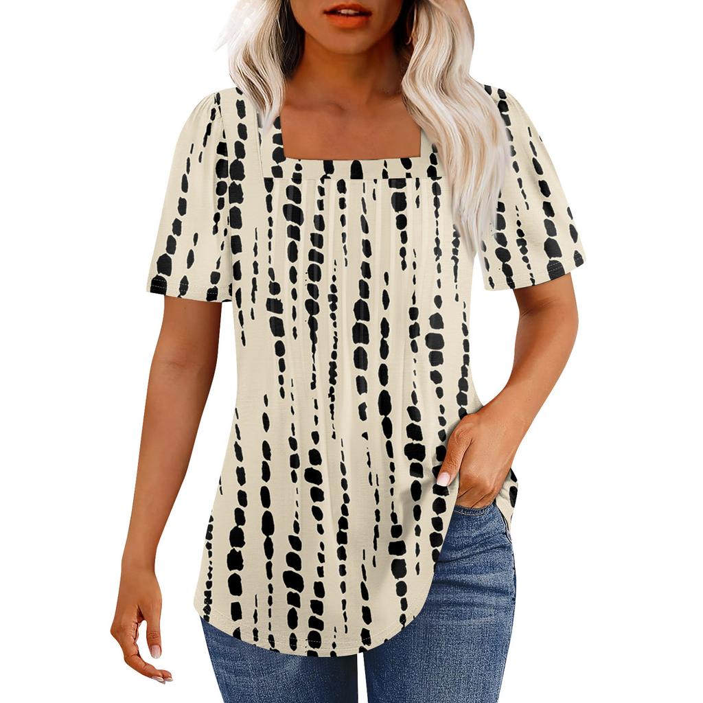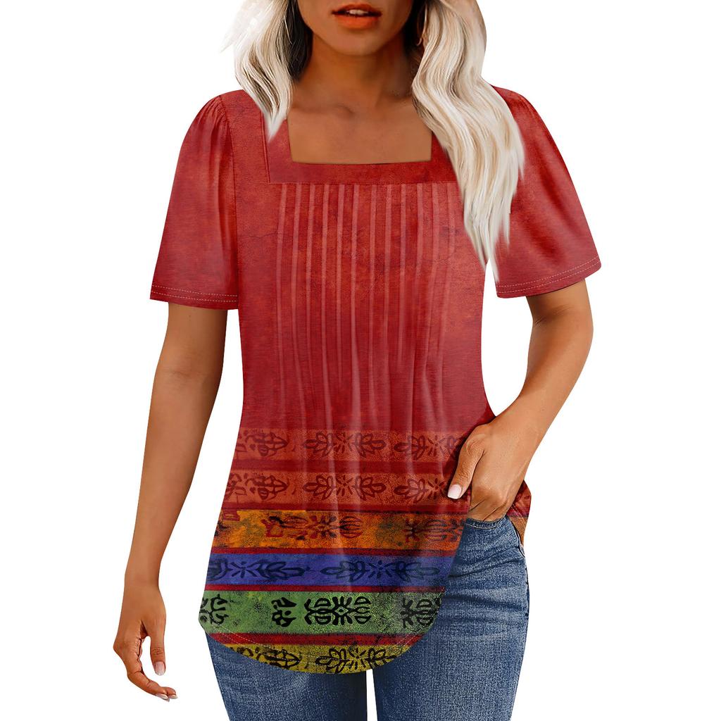 Футболки для женщин, плиссированные, с квадратным вырезом, нарядные, повседневные, блузки с принтом, с коротким рукавом, летние топы свободного кроя