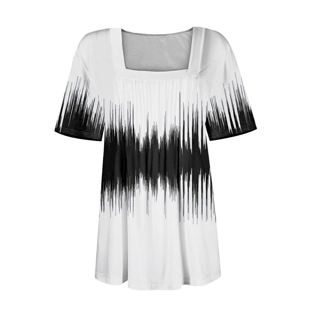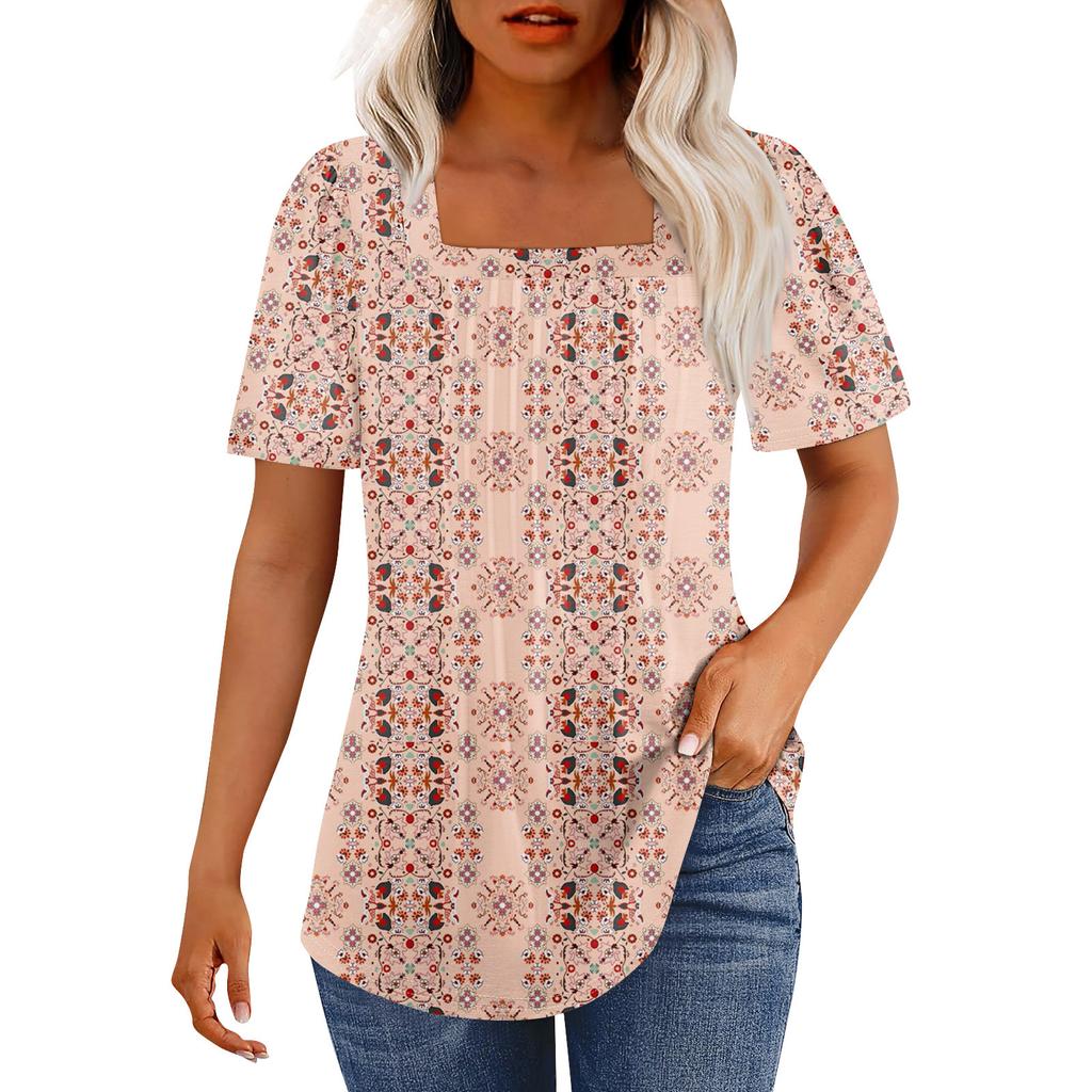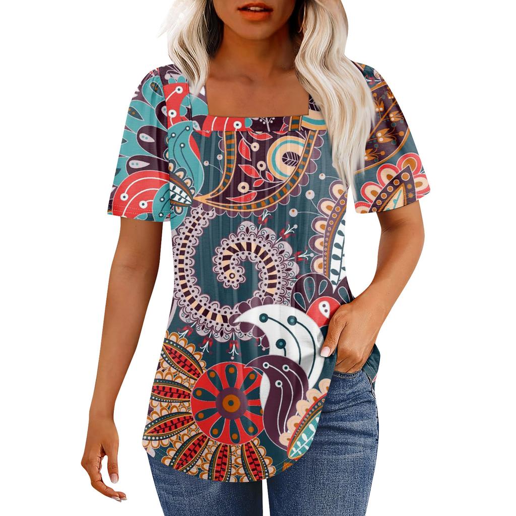 Футболки для женщин, плиссированные, с квадратным вырезом, нарядные, повседневные, блузки с принтом, с коротким рукавом, летние топы свободного кроя