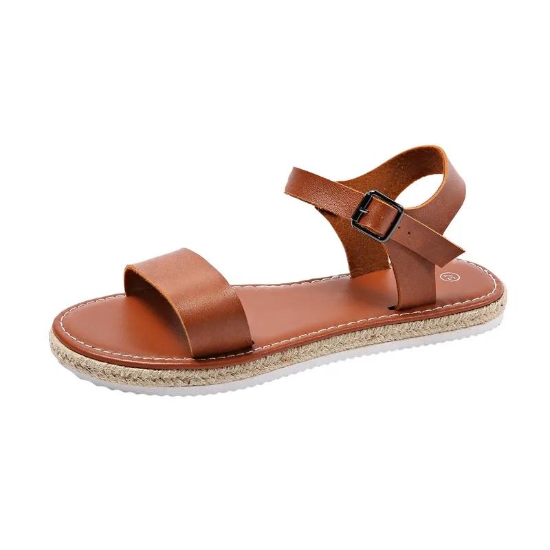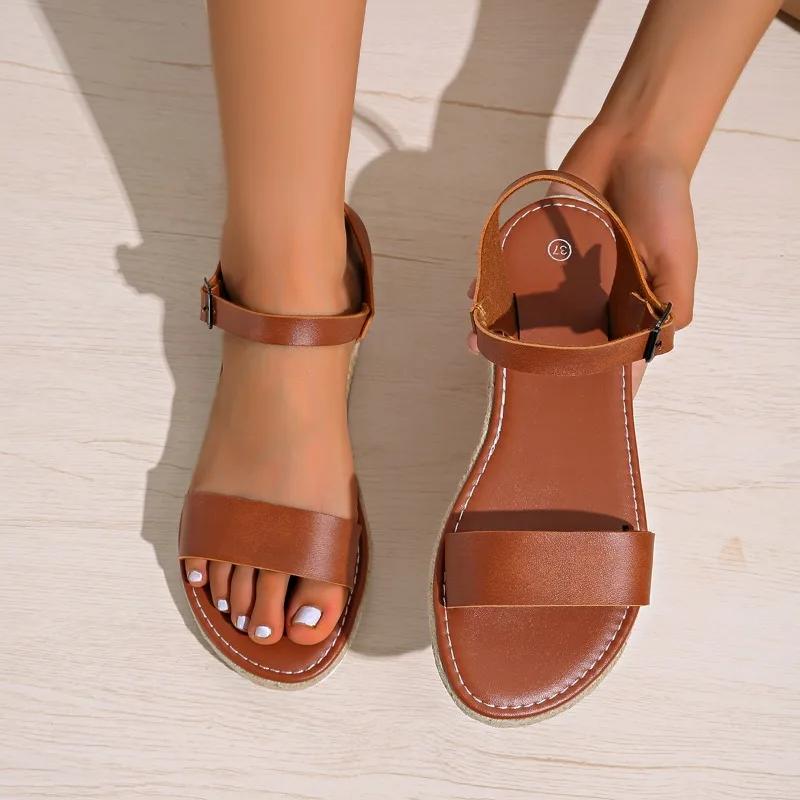 Обувь женская 2024 года, горячая распродажа, женские сандалии с ремешком на щиколотке, летние с открытым носком и пряжкой, однотонные, повседневные, пляжные, большого размера, сандалии
