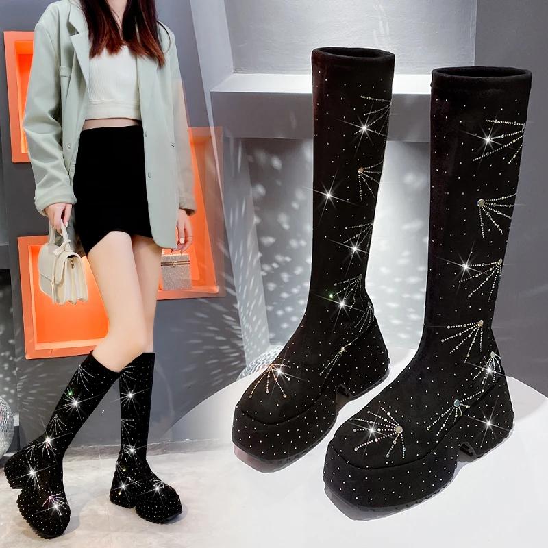 Блестящие женские сапоги со стразами, модные женские сапоги до колена 2024 года, черные длинные сапоги на толстой подошве, увеличивающие рост