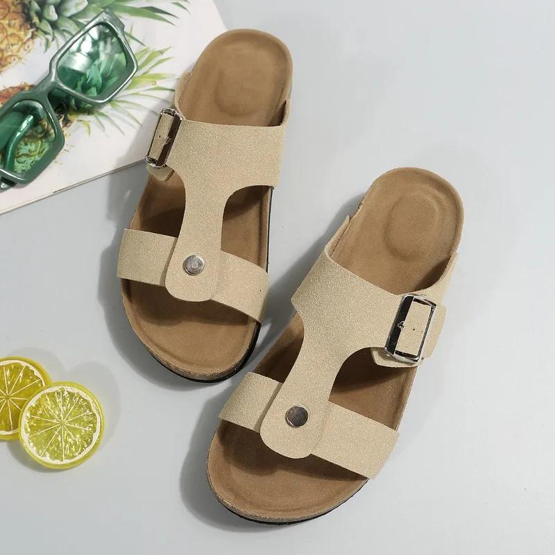 2024 Новые модные универсальные однотонные женские тапочки с пряжкой, с открытым носком, удобные пляжные туфли на плоской подошве с неглубоким носком