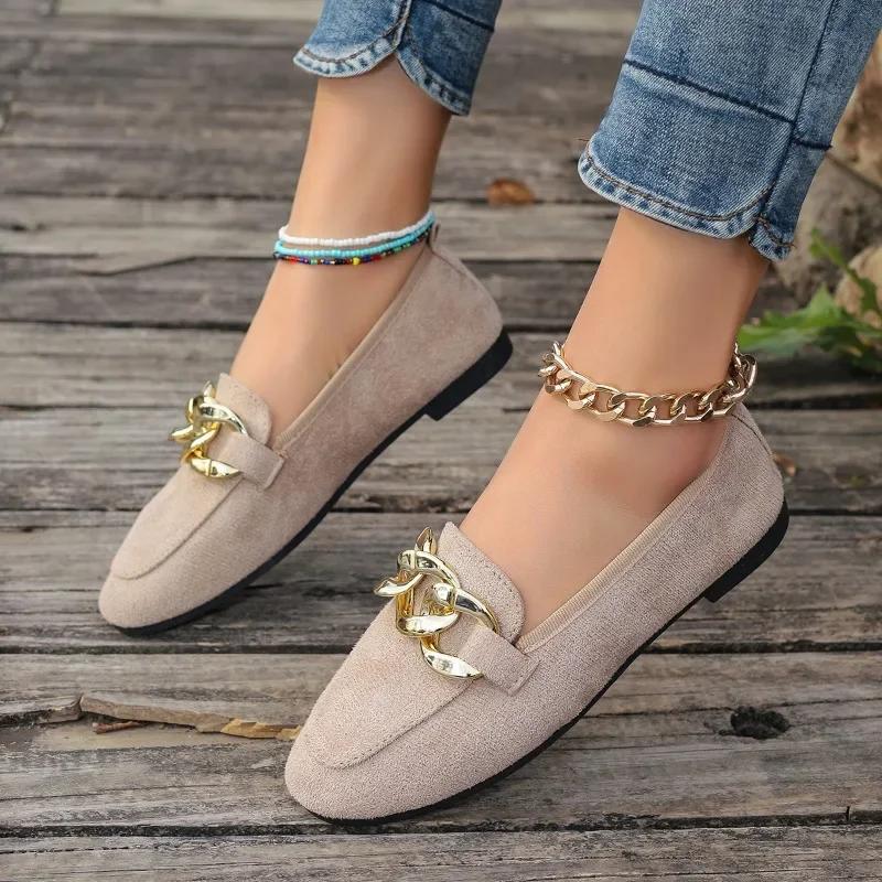 2024 Высококачественная женская обувь Новая мода однотонные женские туфли без застежек на плоской подошве с металлическим украшением и круглым носком Мокасины на плоской подошве