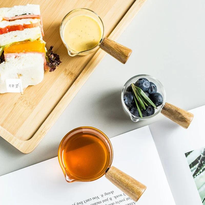 1 шт. Многофункциональная стеклянная соусница, маленькая миска для приправ, домашняя миска для уксуса и соевого соуса, мини-стеклянная чашка для кофе эспрессо, кувшин для молока, сливочник с деревянной ручкой, столовая посуда