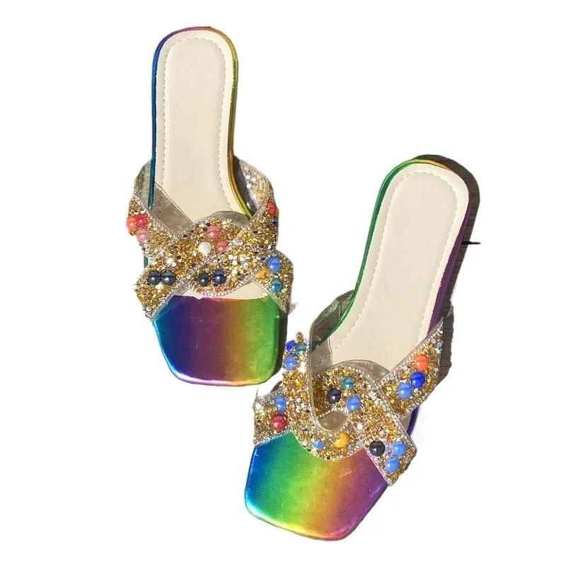 Высококачественные женские тапочки, летняя новая женская обувь, хит продаж, цветная отделка стразами, женские туфли на плоской подошве большого размера