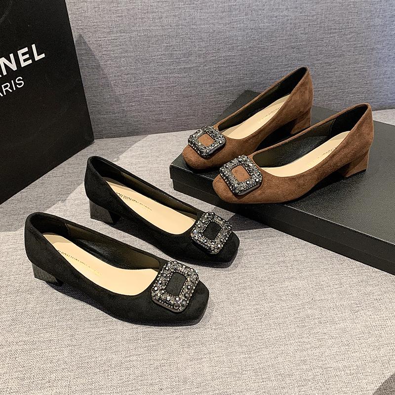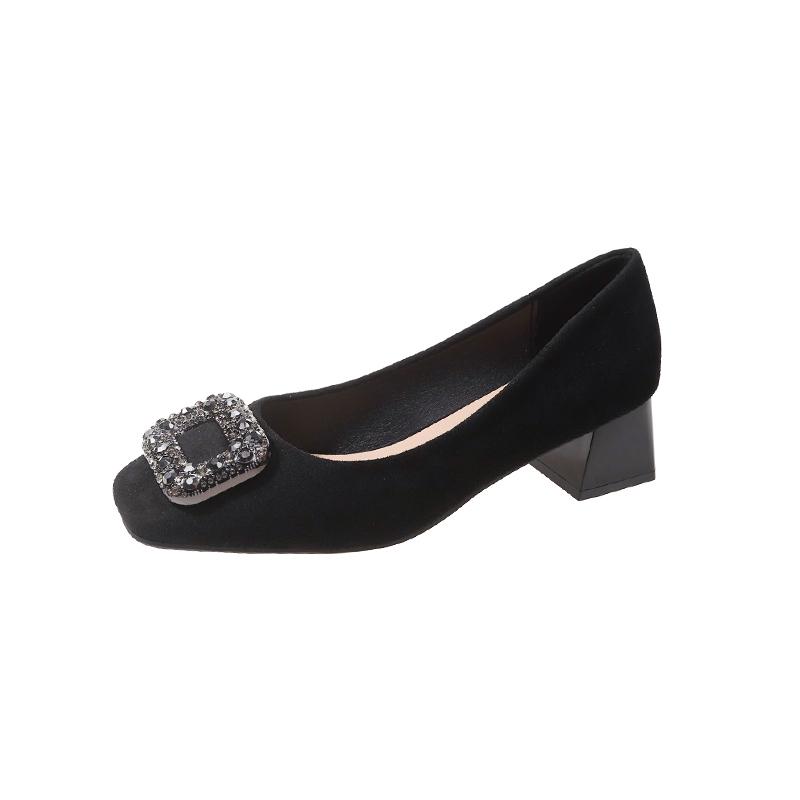 2024 Женские туфли с квадратным носком и квадратной пряжкой, женские туфли со стразами и неглубоким носком на высоком каблуке, элегантные французские замшевые туфли