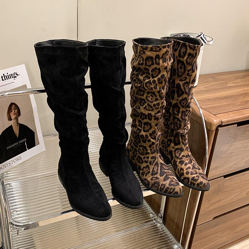 Сапоги на квадратном каблуке до колена, современные туфли без застежек с острым носком, женские туфли на распродаже 2024 года, модные женские сапоги с леопардовым принтом на низком каблуке