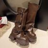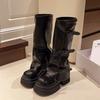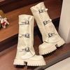 Зимние женские высокие сапоги на платформе и каблуках, модная обувь 2025 года, новый бренд, до колена, пряжка, мотоцикл