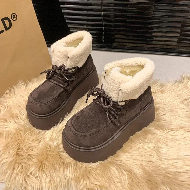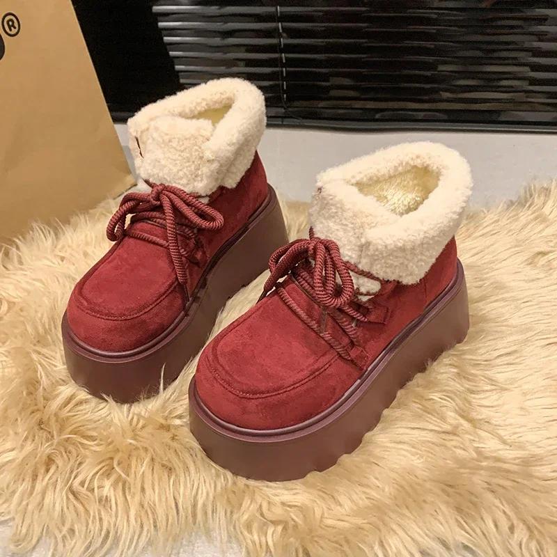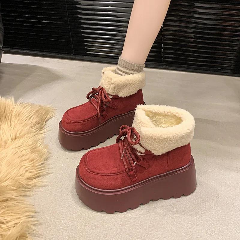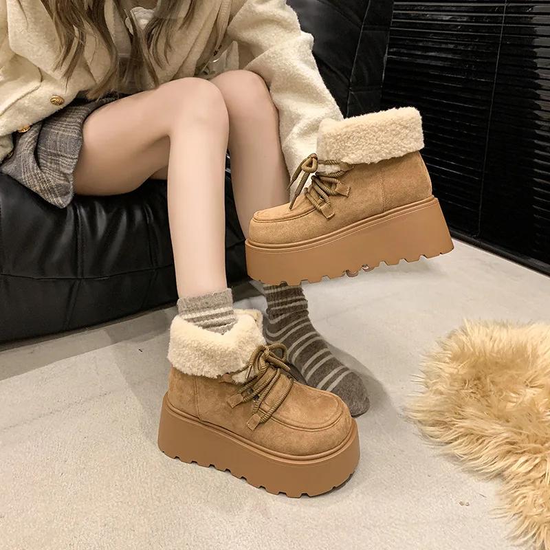 Ботильоны женские на платформе с мехом, теплые зимние ботинки, замшевые зимние ботинки для женщин, новинка 2025 года, хлопковая обувь для мотоциклистов