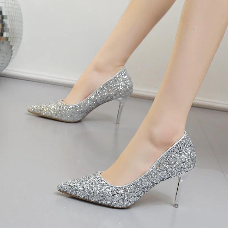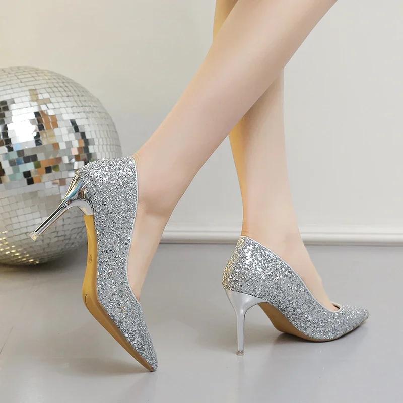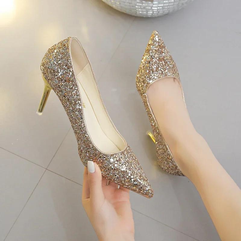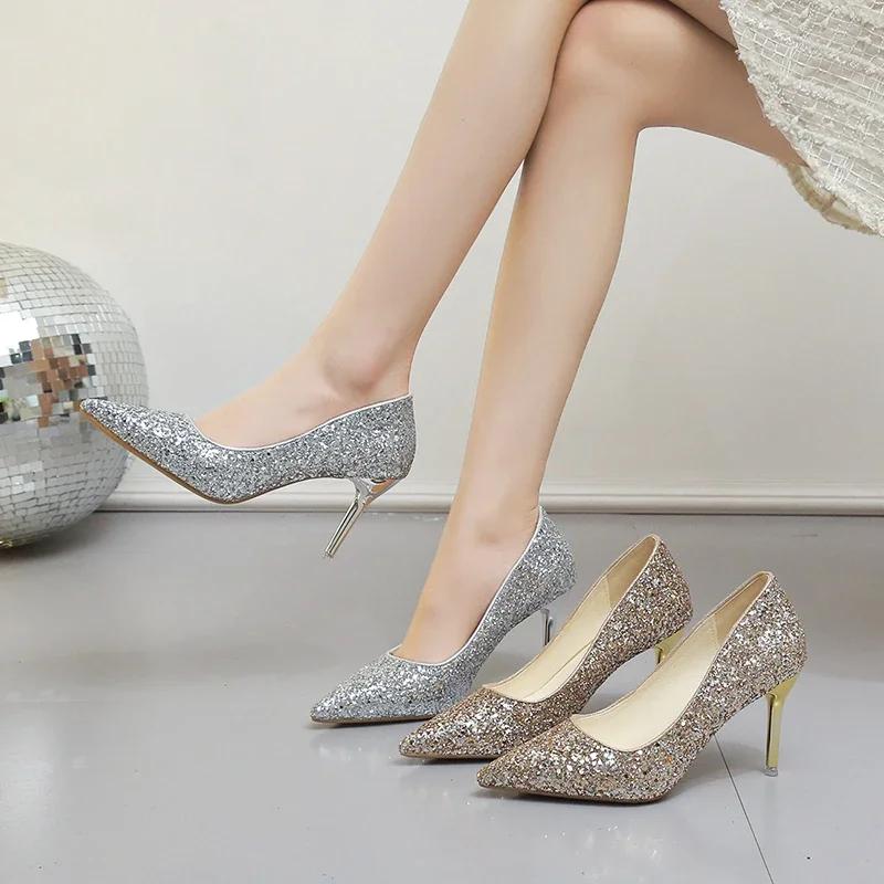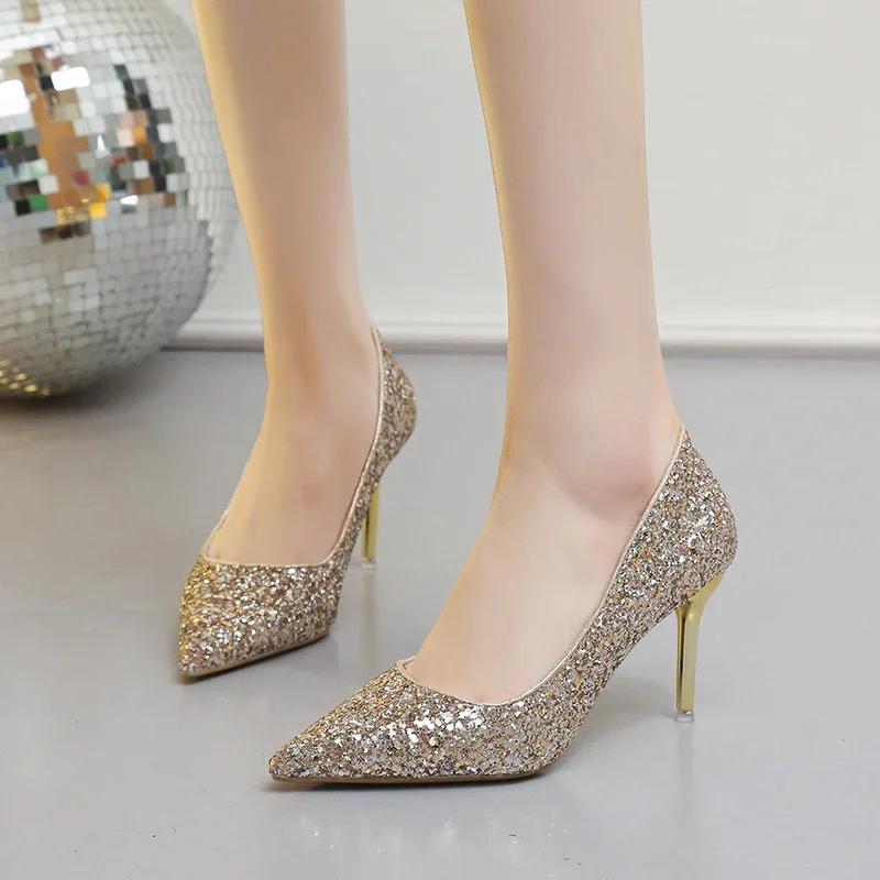 Модные женские туфли на высоком каблуке с блестками на тонкой шпильке, банкетные свадебные туфли, новинка 2024 года, осенне-зимняя пикантная женская обувь для вечеринок с острым носком