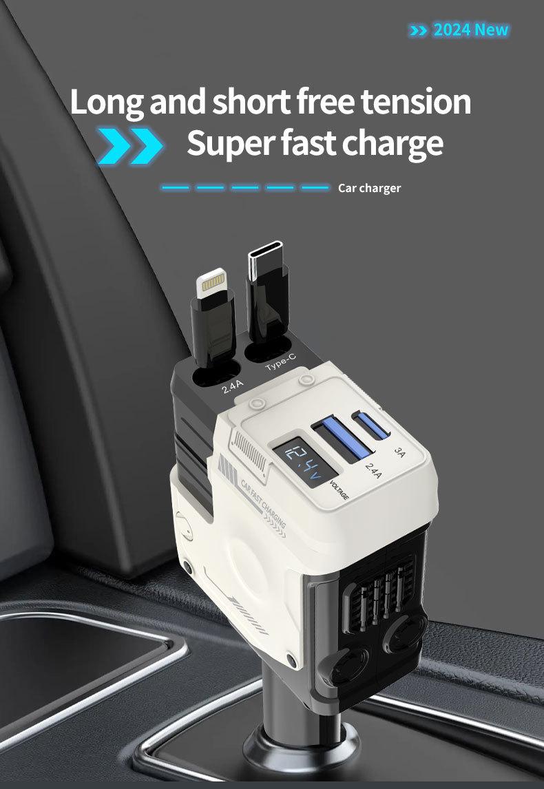 • Функциональность «4 в 1» :Этот универсальный продукт представляет собой USB-кабель типа «4-в-1», который служит зарядным устройством, прикуривателем и т. д. для удовлетворения различных потребностей.