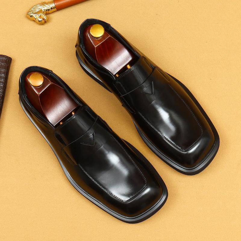 Туфли из глянцевой кожи с толстой подошвой и большим носом. Мужские черные деловые повседневные туфли с квадратным носом и одной педалью.