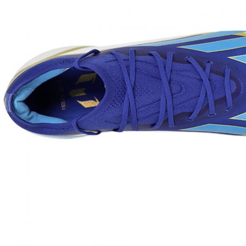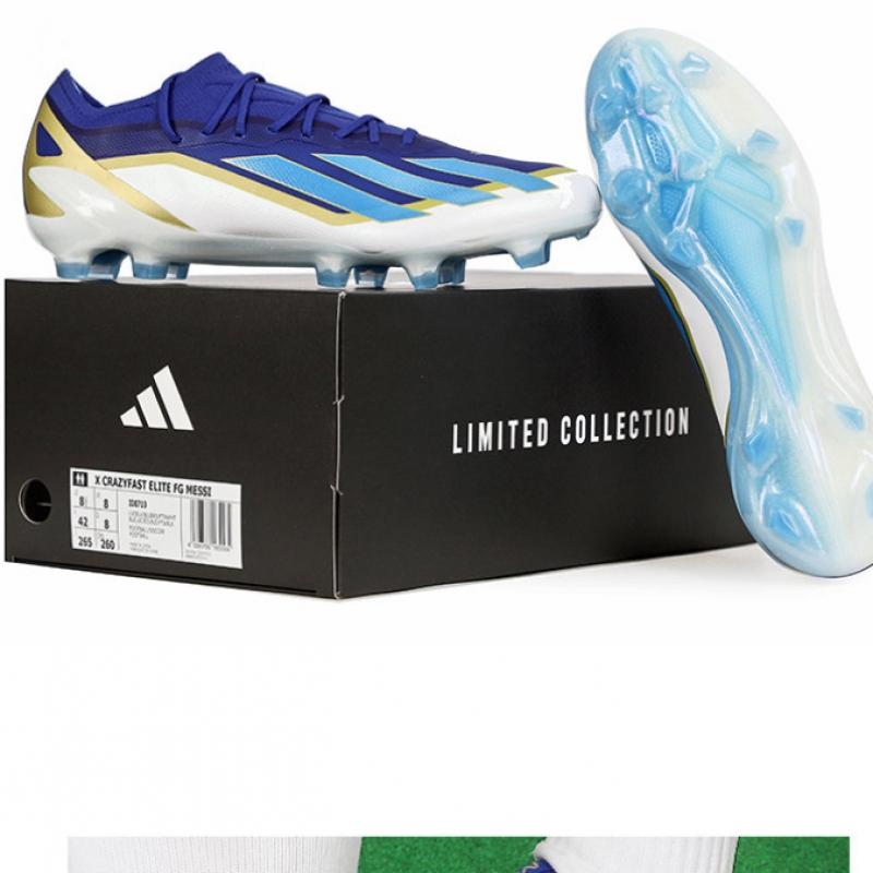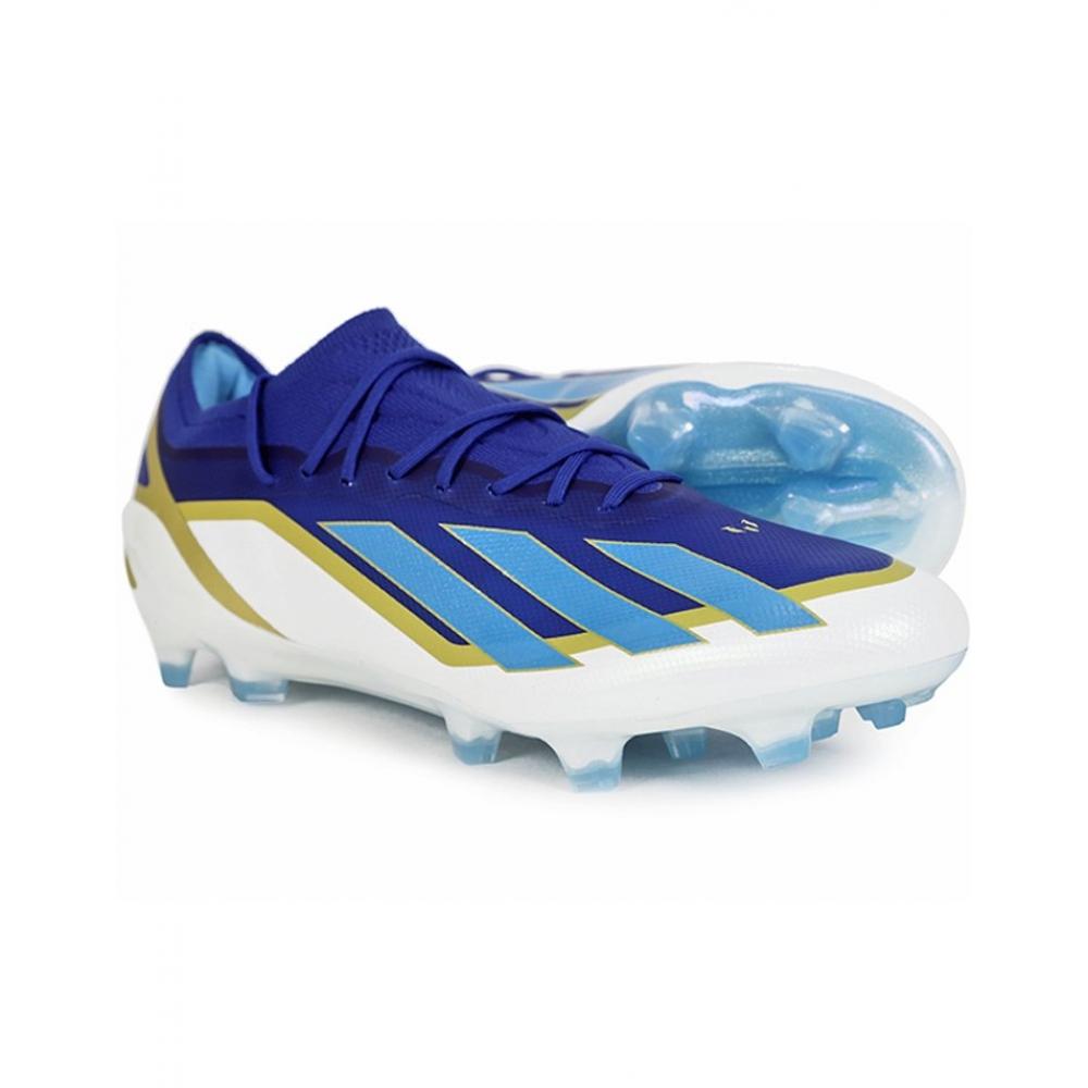 The Adidas X CrazyFast Elite FG Mesh is designed for use on natural grass. Featuring a translucent AeroPass material in blue and white, this soccer shoe stands out for its sleek appearance. The Adidas Primeknit collar secures the ankle, while the speed frame outsole provides stable support with its studs.