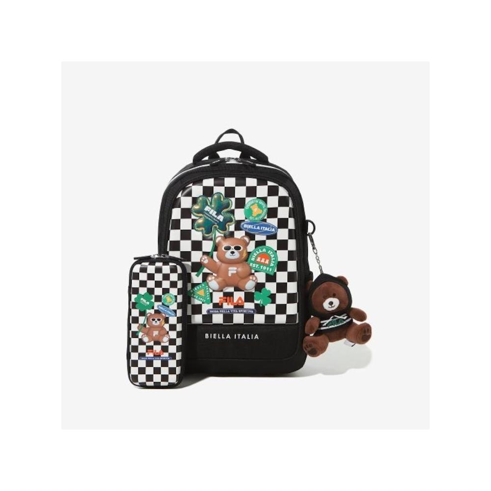 Школьный рюкзак [FILA KIDS] Медведь в моей сумке (модель: Q0ZFK3BEG1004X_BLK) имеет практичный и милый дизайн медвежонка, который нравится детям. Рюкзак изготовлен из прочного полиэстера как для внешнего, так и для внутреннего слоев, что обеспечивает долговечность и легкость чистки.. Размеры сумки (W) 28,5 см х (ЧАС) 38см x (D) 12,5 см, и весит 0,6 кг (исключая пенал). Этот рюкзак произведен компанией FILA Korea Co., Ltd., в Китае, и проверен на соответствие правилам безопасности детской продукции.