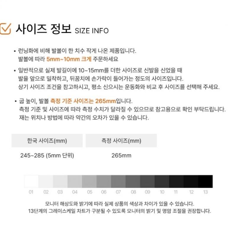 This product runs half a size smaller compared to regular running shoes. It is recommended to order 5mm-10mm larger based on your foot width. Generally, it is suitable to wear a size with an additional 10-15mm to your actual foot length. Available sizes range from 245mm to 285mm in increments of 5mm, with a standard size of 265mm. Please note that there might be discrepancies depending on the measurement method.