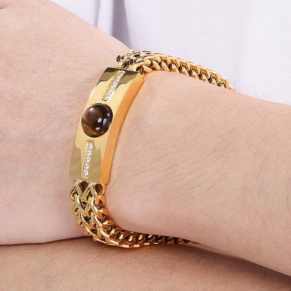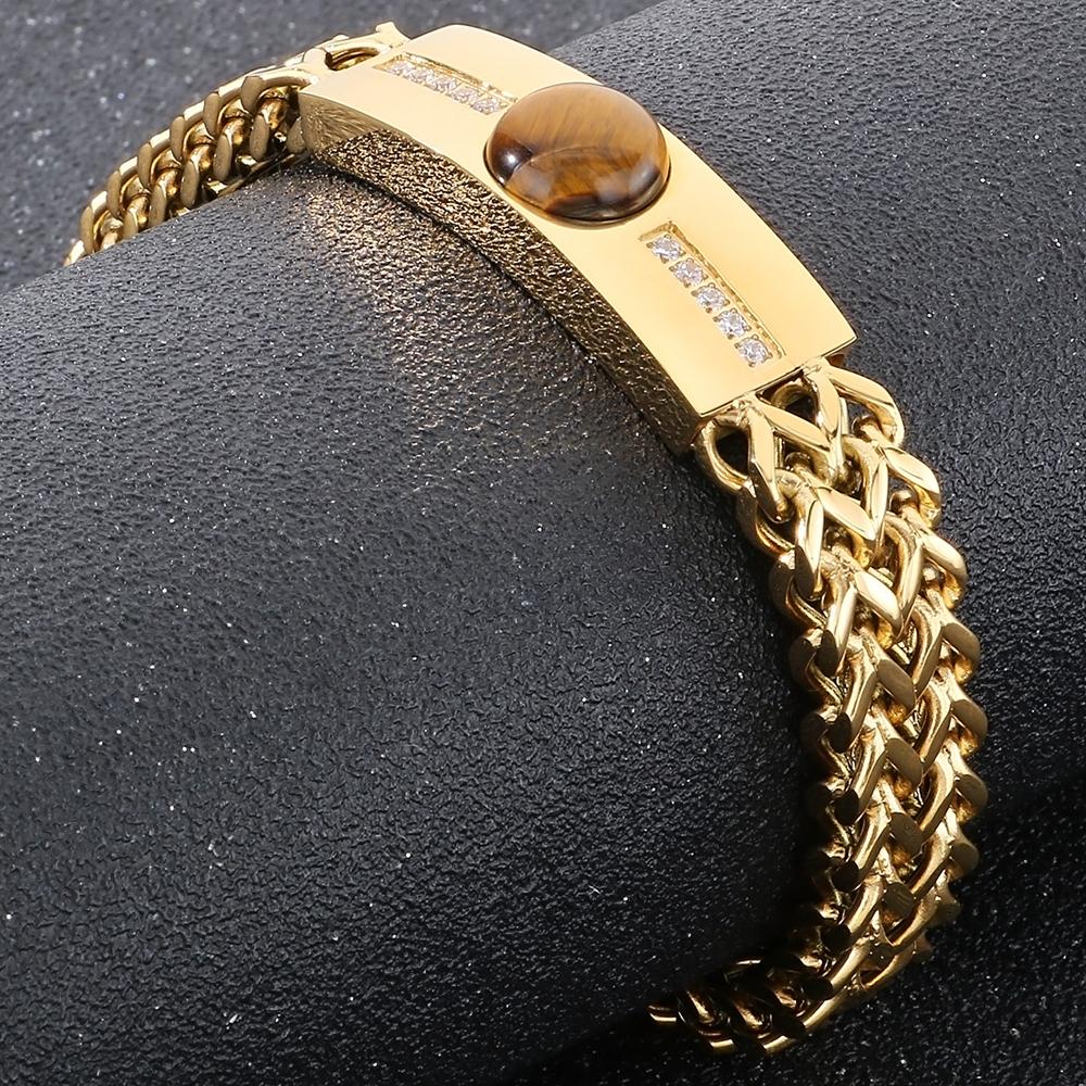 Браслет-цепочка в стиле хип-хоп шириной 12 мм с квадратным плетением Franco, мужской с фианитами и камнем тигровый глаз, роскошные мужские браслеты золотого цвета, которые никогда не выцветают