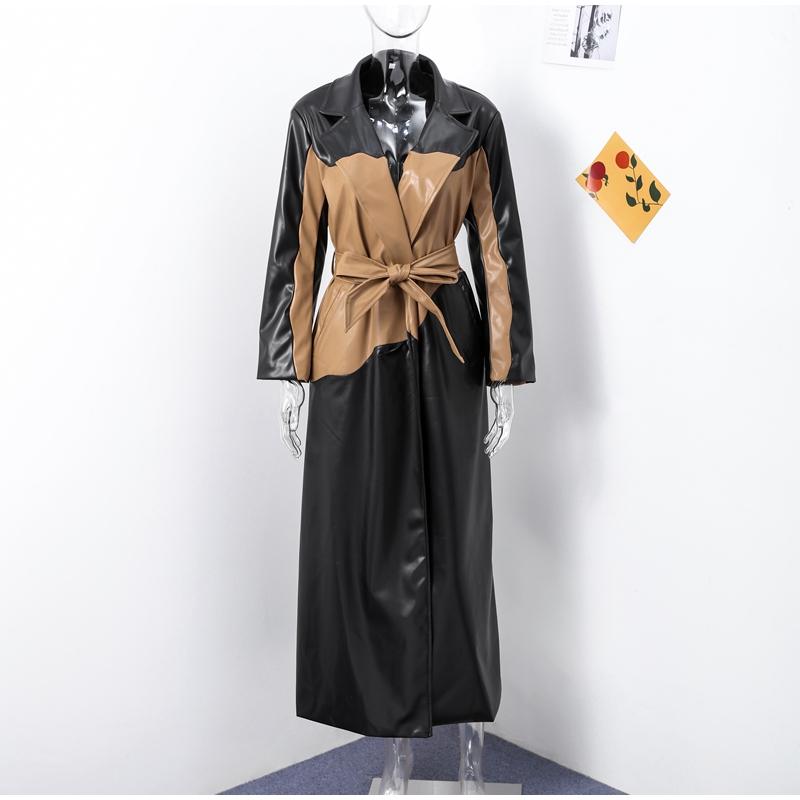 Контрастная кожаная длинная женская куртка со шнуровкой на лацканах с длинным рукавом, женская макси-куртка из искусственной кожи, осенне-зимнее уличное женское пальто с карманами — купить товар онлайн с бесплатной доставкой по всему миру!