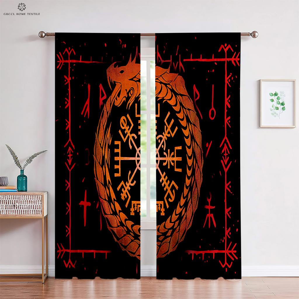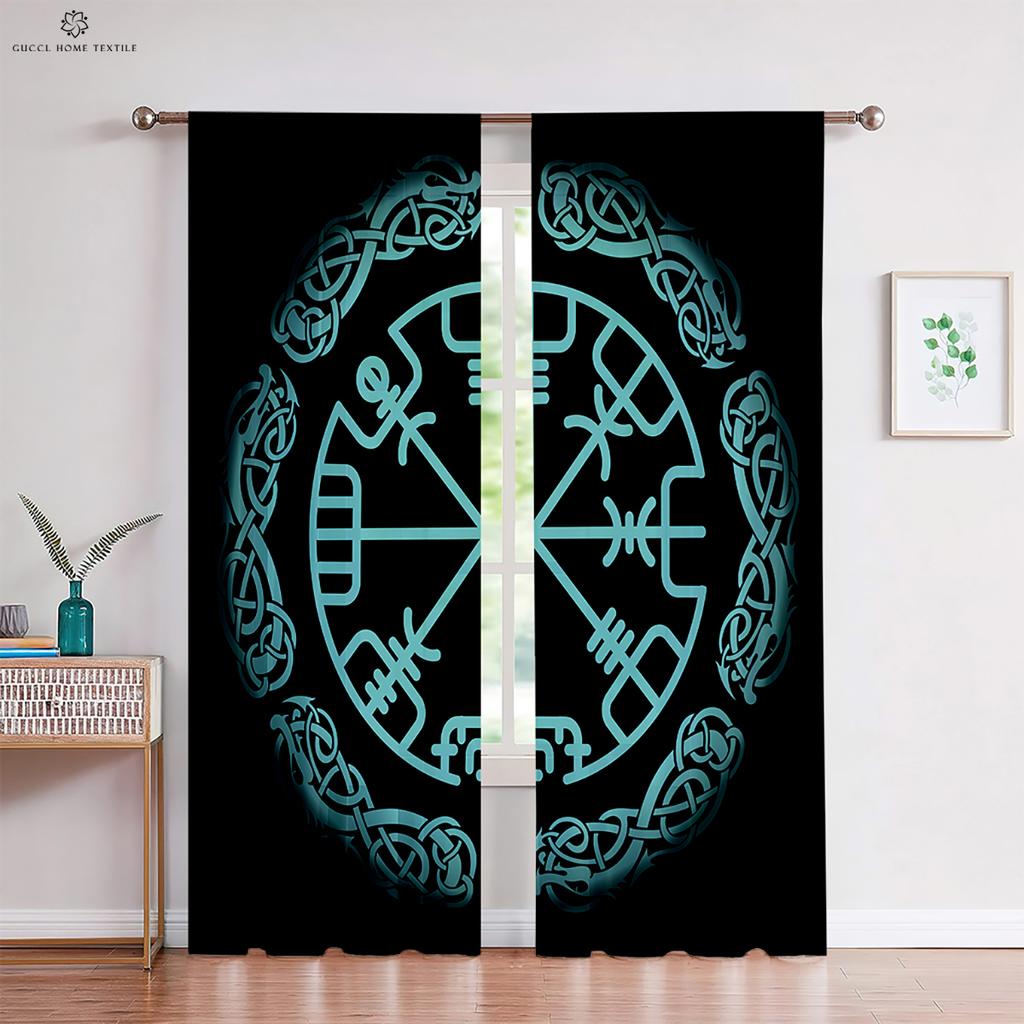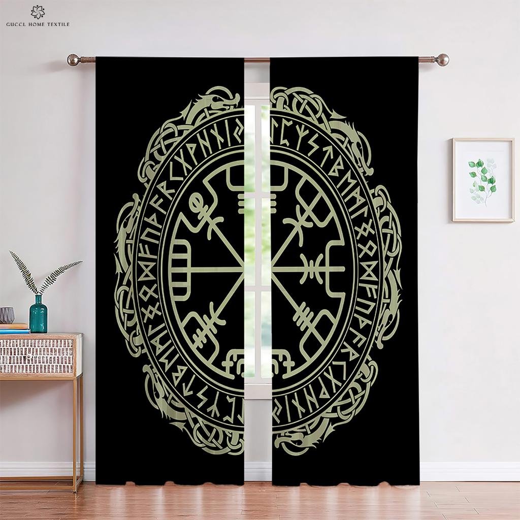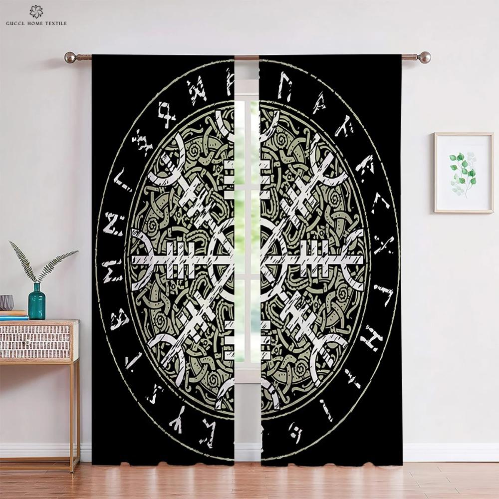 Шторы в темном стиле с узором «Руны» в стиле ретро, принт «Щит викингов», для детской комнаты, гостиной, украшения кухни, 2 шт.