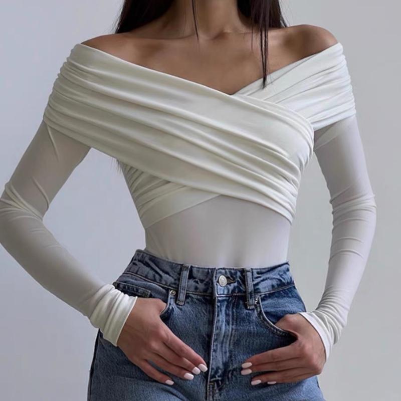 Модные длинные рукава, облегающие, сексуальные футболки с открытыми плечами, женские, с перекрестными складками и вырезом-лодочкой, элегантные, однотонные, повседневные женские футболки, топы 25526 — купить товар онлайн с бесплатной доставкой по всему миру!
