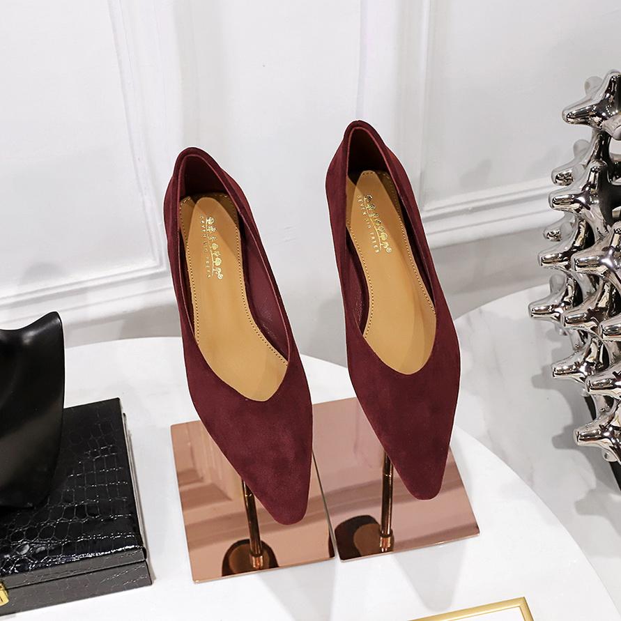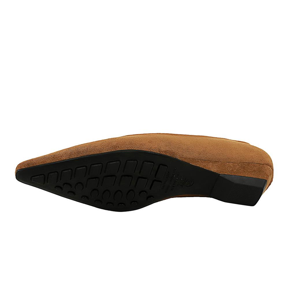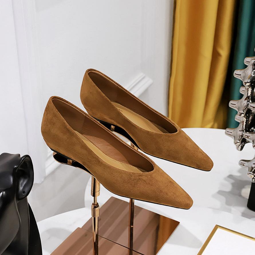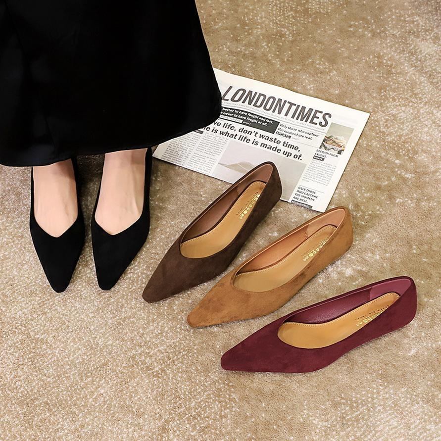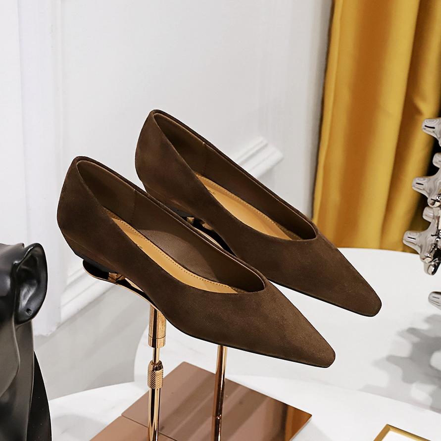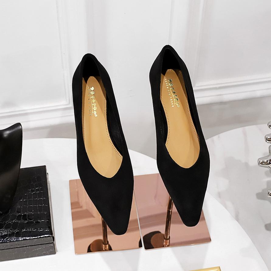 Простые и удобные женские туфли из замши с острым носком и низким каблуком, с неглубоким вырезом