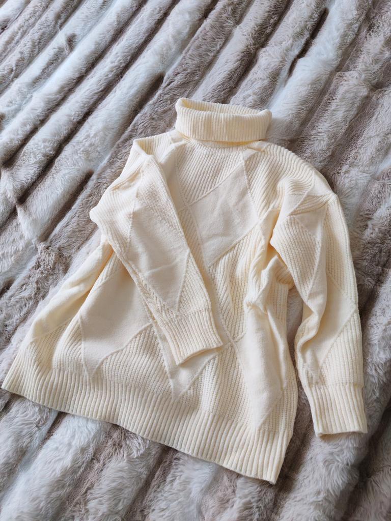 Тёплый свитер с высоким воротом. Всем тёпленький приветик! Нежный, тёпленький, романтичный и это всё о нём! Довольна как слоник! На выбор представлены 12 цветов, я заказала модный цвет - цвет сливочного масла. Размеры от S до 5ХL. Заказанный мной размер 3XL на Мои параметры: рост 175 см, ОГ - 104 см, сел идеально, хотелось как оверсайз, но не вышло не множечко), длина 72 см. Вязка аккуратная, тактильно очень приятная, очень мягкая, нежная, отлично тянется. Высокий ворот. Геометричный вязанный рисунок спереди, сзади без рисунка - сплошная вязка. Товар и продавца рекомендую всеми ручками! Спасибо продавцу и любимому Джум! Всем приятных покупок!