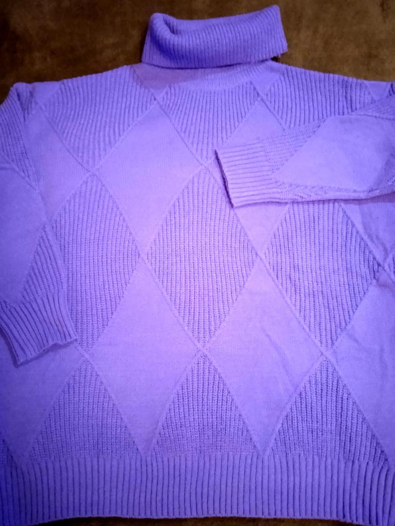 Свитер лавандового цвета подошёл по размеру, мой ог 102, рост 167. Сидит свободно, но не оверсайз. Цвет очень красивый. На моём фото цвет исказился, фактически он соответствует фото продавца. Пряжа мягкая синтетика, очень сильно электризуется, нужен антистатик. Горловина сшита швом наружу, пришлось переделать. В целом, покупкой довольна. Дополняю: сегодня весь день была в свитере, покрылся катышками в местах плотного соприкосновения с подкладкой верхней одежды. Долго носить его не придётся, потеряет внешний вид. Очень жаль