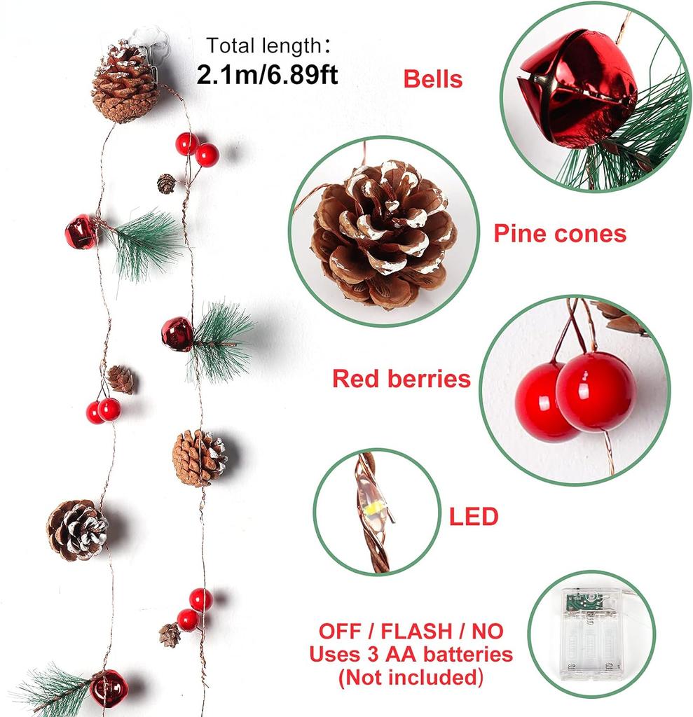 Рождественская гирлянда Красная ягода, Искусственная гирлянда из сосновых шишек со светодиодной подсветкой 7 футов 20 светодиодов Зелень Декор для камина Домашний Рождественский Внутренний Наружный Декор