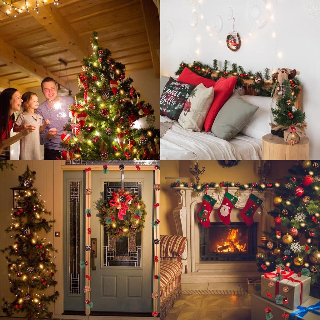 Гирлянда украшена сосновыми шишками, колокольчиками, красными ягодами и сосновыми ветками.. Это очень мило! По-настоящему волшебные огоньки! Вы также добавите на него другие мелкие украшения, чтобы придать ему желаемую форму.