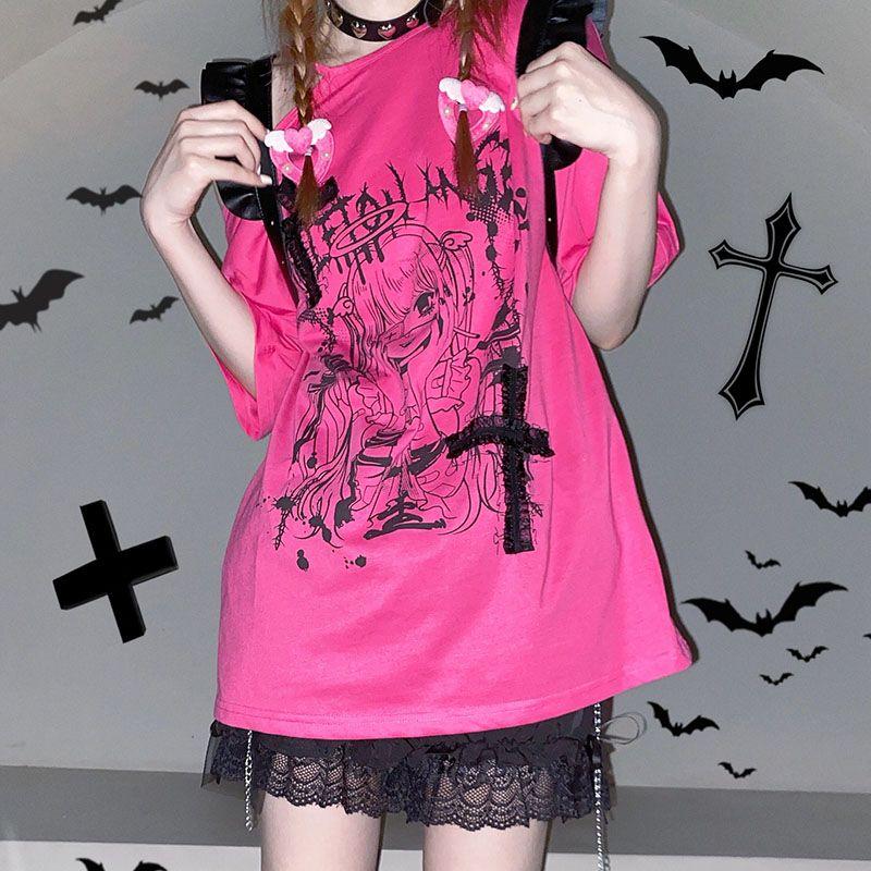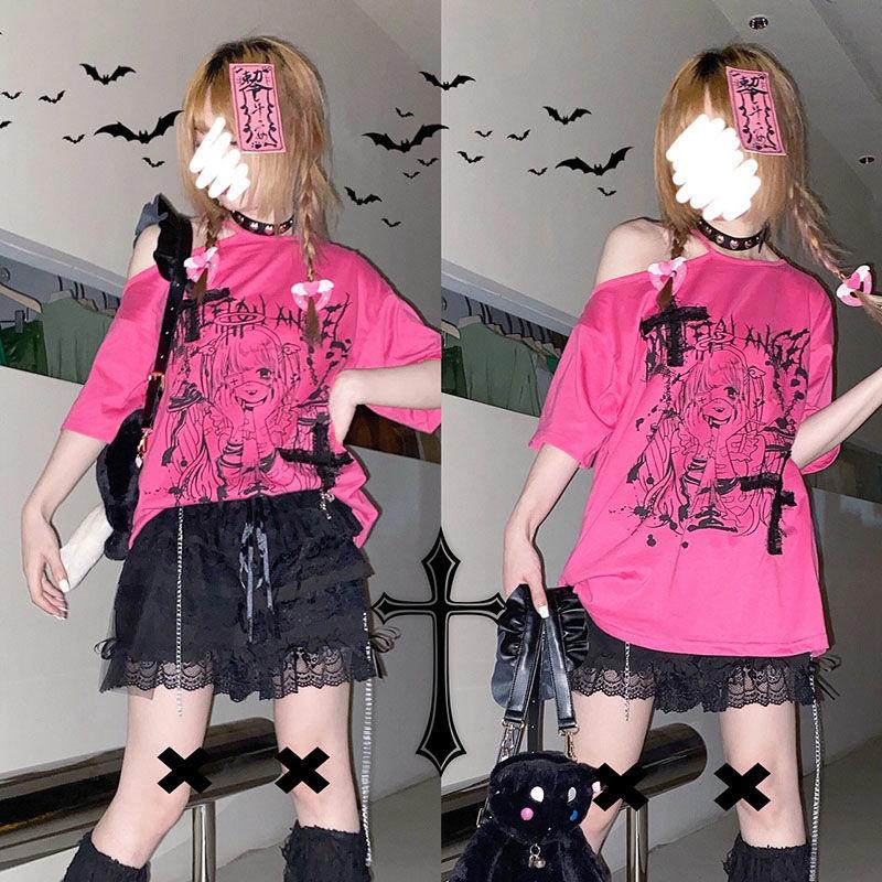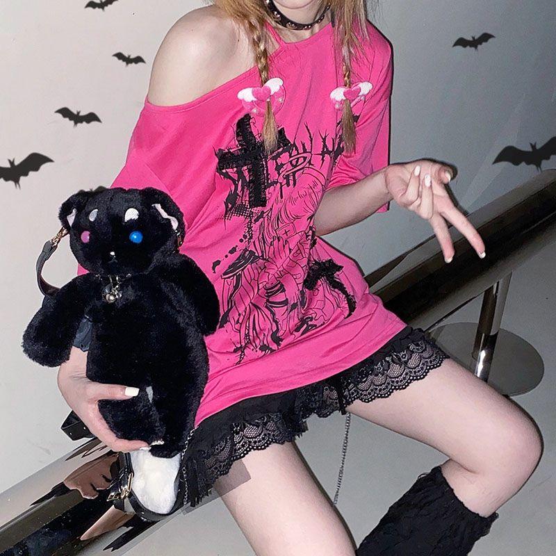 Женская футболка субкультура панк роза красная сладкий принт короткий рукав футболка женская Y2k с открытыми плечами сексуальный уличный стиль свободные футболки