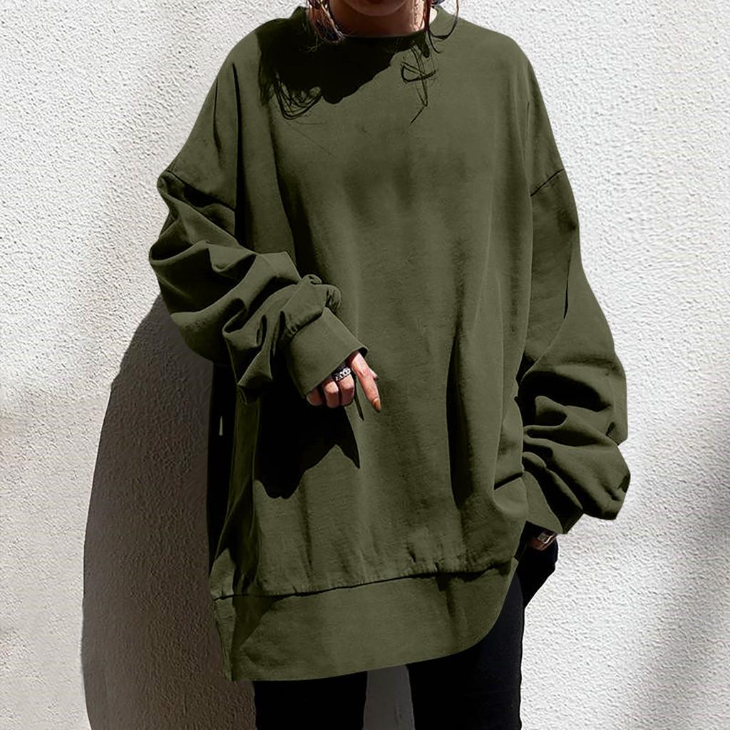 Женская мода повседневная свободная толстовка с круглым вырезом и длинным рукавом, однотонная длинная толстовка