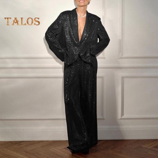 Ослепительный дизайн с пайетками: Украсьте свой гардероб ослепительным дизайном из пайеток, украшающим верх и брюки этого костюма.. Сделайте заявление с помощью сверкающего блеска, который добавит гламурности вашему образу, идеально подходит тем, кто ценит привлекающие внимание детали.