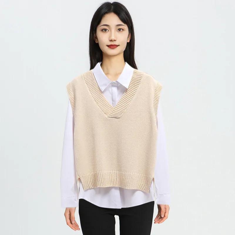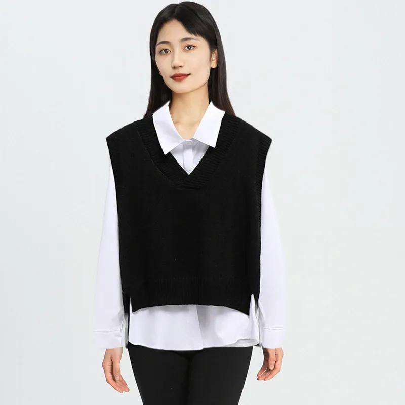 Осенняя женская мода: короткий вязаный жилет и рубашка с длинными рукавами